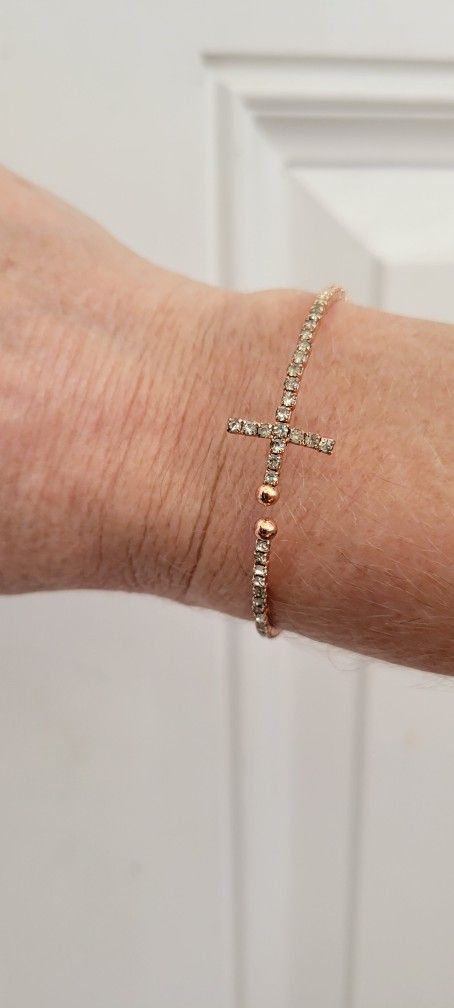 Rose gold toned cross bracelet w cubic zirconia all around the bracelet. Fits wrist sizes 6.5 to 8.5".