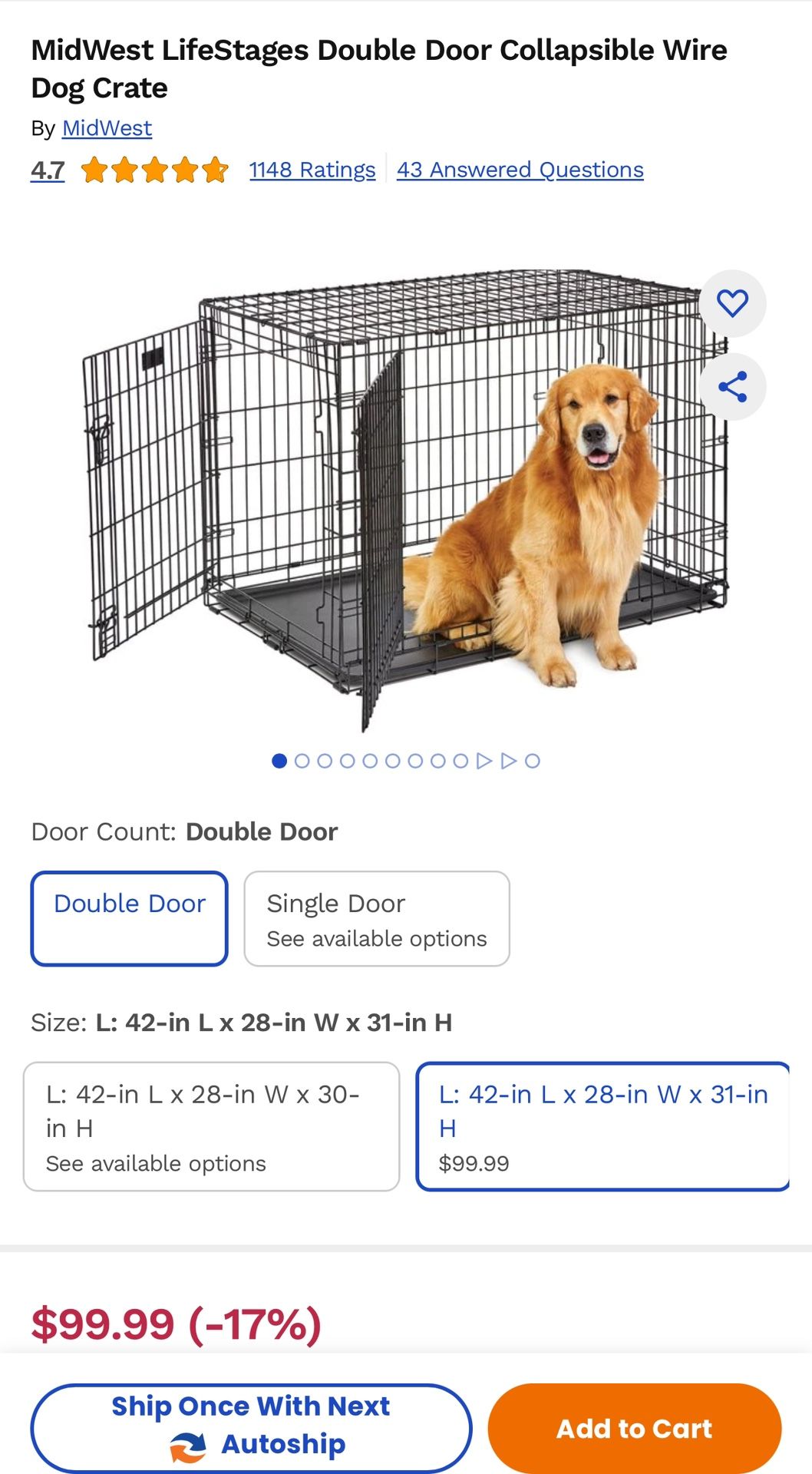 Used metal dog crate in good condition. L: 42-in L x 28-in W x 31-in H
