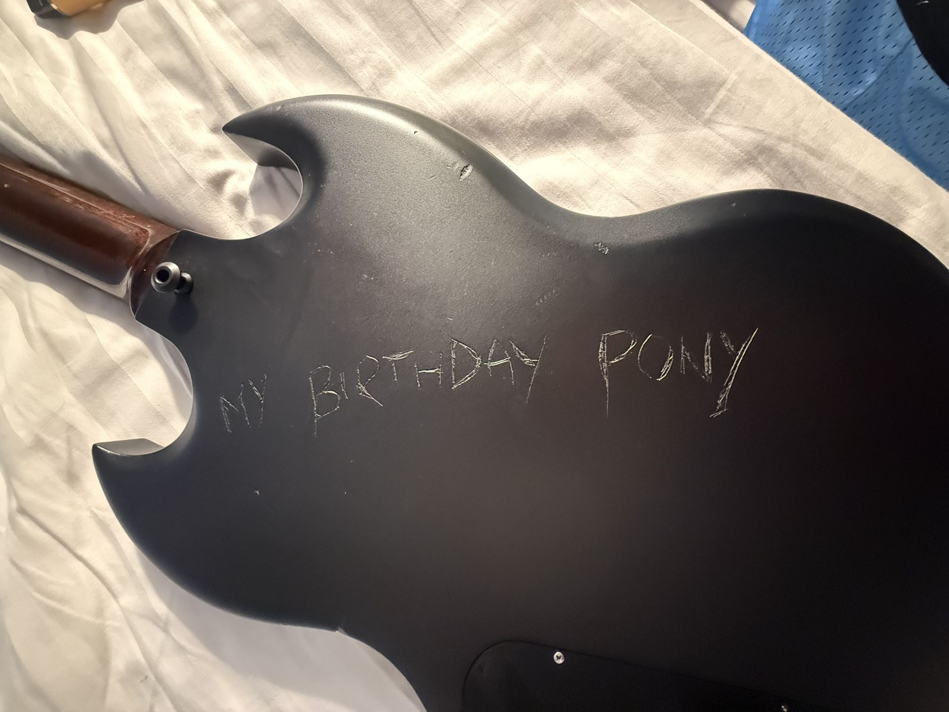• Brand: Gibson (logo clearly visible on the headstock) • Body shape: SG (double cutaway, thin body) • Finish: Satin or matte black • Pickguard: Large silver/metallic SG-style guard • Pickup configuration: Single humbucker, and it appears to be an EMG active pickup (the EMG logo is visible) • Bridge: Tune-o-matic bridge with a stopbar tailpiece • Controls: Likely volume + tone with a 3-way toggle (typical SG layout) • Fingerboard: Rosewood with dot inlays This setup (single EMG pickup) is often favored for heavy rock or metal, with a tight, high-output sound. Has “my birthday pony” engraved in the back. Bought it like that of someone. So it has some character already. Selling as is.