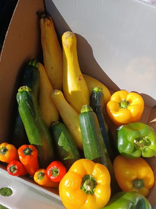 Good morning. Tomatoes, yams, potatoes, squash, zucchini, assorted colored bell peppers, red onion, and white onions, are the selection. All prices negotiable....of course. Have a a great day!