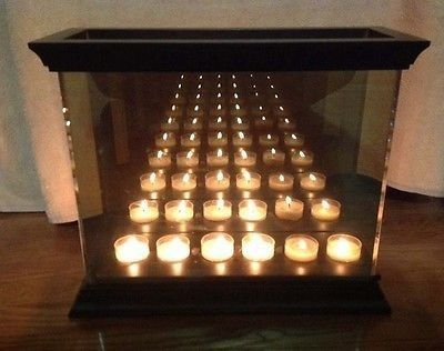 New and unused. Unpacked only to take pics for listing. Guaranteed to have never been used but there is a flaw. A scratch on the right side of the bottom metal base. Comes with either a set of 6 votives or 6 tea lights. Easy no tool assembly. Takes less than 5 mins. Details: Measures 12" h x 6" w x 14" l Construction: Metal top/base, 2 mirrored glass panels, rubber corner protectors and rubber feet Weighs: Approx 10 lbs