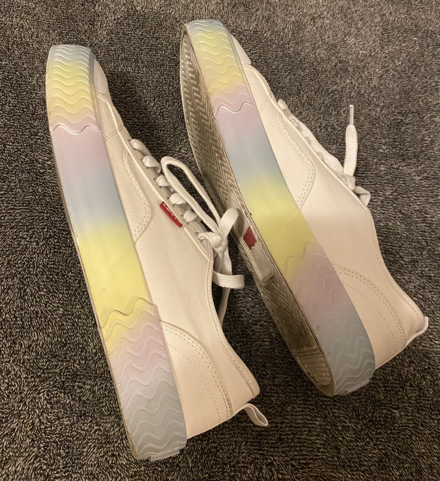 Gently used but great condition. Size: 8.5 in Women’s These classic white Levi’s sneakers feature a unique pastel/iridescent gradient sole that shifts through shades of yellow, purple, and blue. Perfect for adding a pop of color to a casual outfit! • Brand: Levi Strauss & Co. • Material: Durable white canvas upper with a sturdy rubber sole. • Design: Low-top lace-up with the iconic red Levi’s logo tab. • Sole: Textured "wave" grip with a beautiful multi-color ombre effect. • Fit: Light and breathable, ideal for spring and summer wear. If you’re seeing this listing, it’s available for porch pickup ONLY. Venmo, Zelle or cash. No holds without pre-payment. Please give me a specific time for pickup.