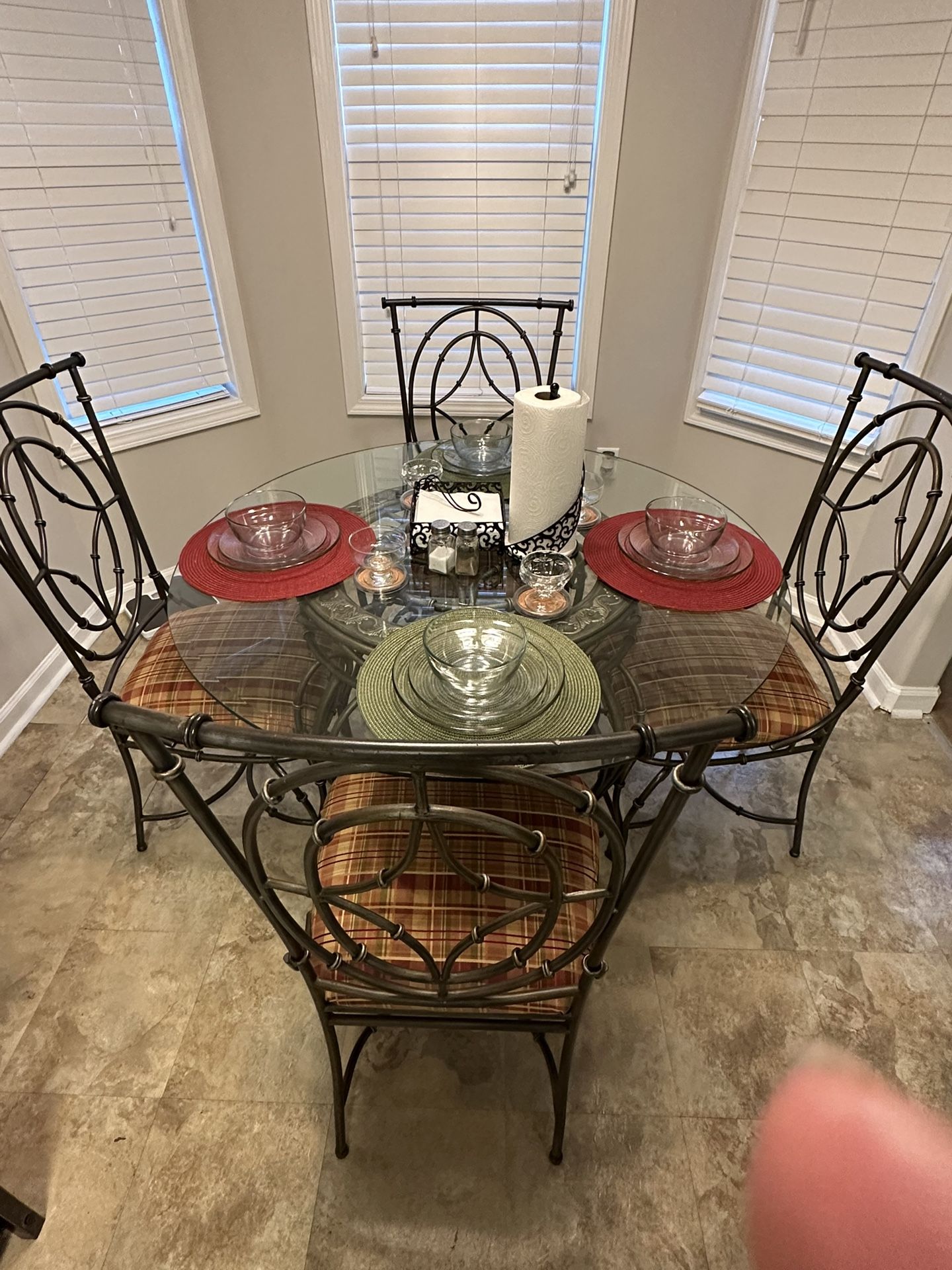 Wrought Iron Glass table set in very good condition with 4 chairs. Very heavy! Non smoking house and no pets.