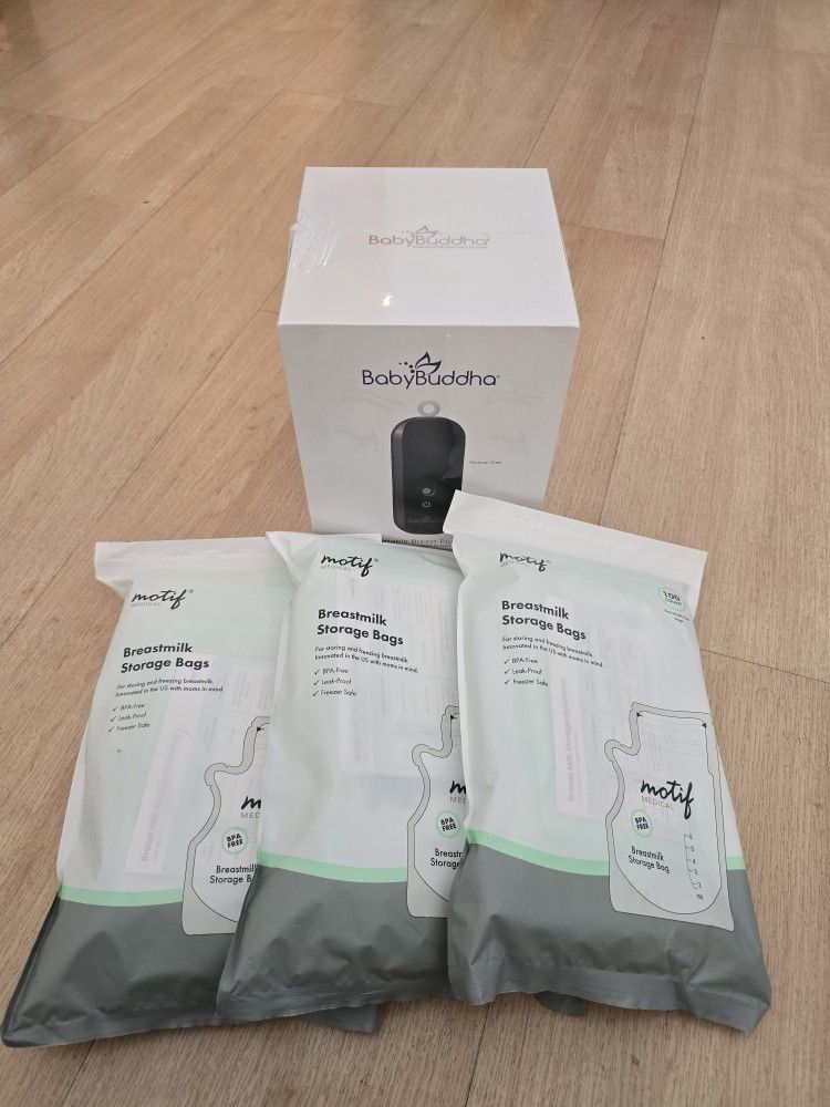 BabyBuddha Breast Pump Hands Free - Portable & Compact with 15 Levels of Control - Battery Powered Electric Breast Milk Pump - Quiet Single/Double Wearable Breast Pump - Brand New In Box Sealed + x3 Packs of 100 8oz Storage Bags for Freezer Pump Kit: Features & details PORTABLE AND COMPACT: While other breastfeeding pumps are too bulky and drag you down with their weight, the BPA Free BabyBuddha double electric nursing pump is conveniently small and can be hung around your neck using the included lanyard. You can now free your hands and pay more attention to your baby as you pump. EXTRA-QUIET OPERATION: We’ve fitted our machine with an impressively quiet mechanism that makes for discreet and silent pumping. Freely pump without waking up your little one or drawing unnecessary attention to yourself. HYGIENIC DESIGN: We take the safety of your newborn very seriously. That’s why our breast milk feeding pump comes with a closed system to ensure milk doesn’t flow backward and get contaminated. The BabyBuddha infant breastfeeding pump is also BPA-free to keep the integrity of the expressed milk intact. EXPERIENCE THE COMFORT: No dealing with nursing pumps that result in sore nipples. Our double milk pump comes with a soft cushion that mimics a baby’s lips, an anti-backflow design that eliminates the need to lean forward while expressing, and multiple modes to massage the breast and suction the milk. SIMPLE TO USE: No complex controls here. Just use the trackball on the electric breastfeeding pump to easily navigate through the stimulate and suction modes. Our wearable breastfeeding pump machine is also rechargeable to keep it powered as you get things done. + Storage Bags: Features & details MILK STORAGE MADE SIMPLE: Designed to make breastmilk storage as simple as possible, these bags feature an easy-pour spout for a no-mess experience. They lay flat for compact freezer storage or self-stand for refrigerator storage. *For the most accurate measurements, ensure the bottom of the bag is completely flat. NO SPILLS, NO FUSS, NO HASSLE: Easily transfer milk from the bottle to the bag, seal with the leak-proof double zipper lock, label, and store in your fridge or freezer. *Not microwaveable.* FREEZABLE STORAGE BAG: Stores up to 6 ounces of milk. Features a write-on label to keep track of the dates you have pumped for easy organizing.