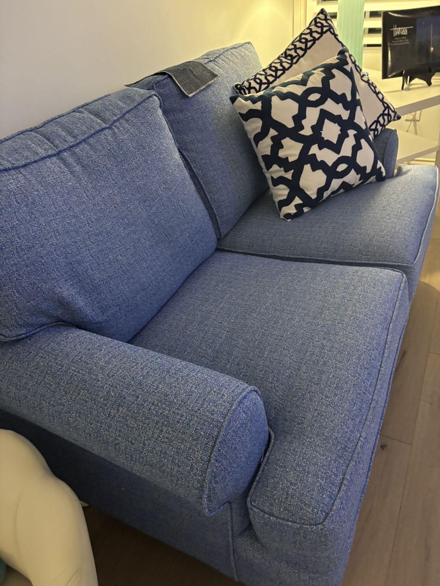 60” new designer sofa beautiful top quality . Kittles. designer is Braxton in US. The color is a beautiful vibrant blue, but doesn’t match my other furniture. Paid $2700. see in Bridgewater in Carmel.