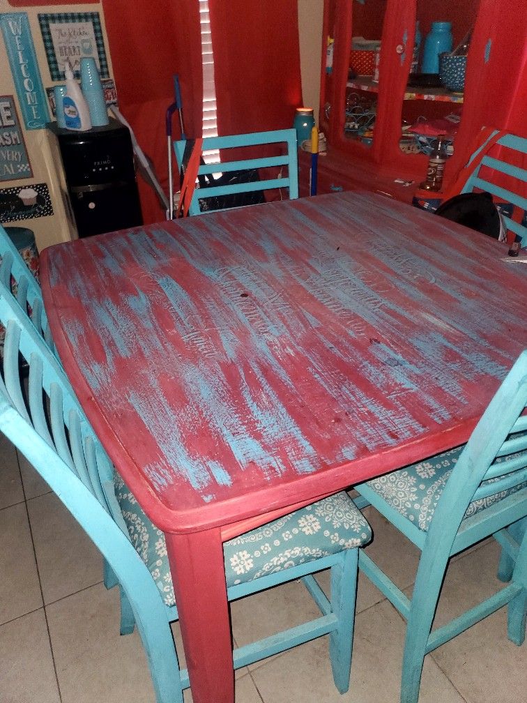 Red and aqua table and 6 chairs. You can easily sand and repaint. In great condition