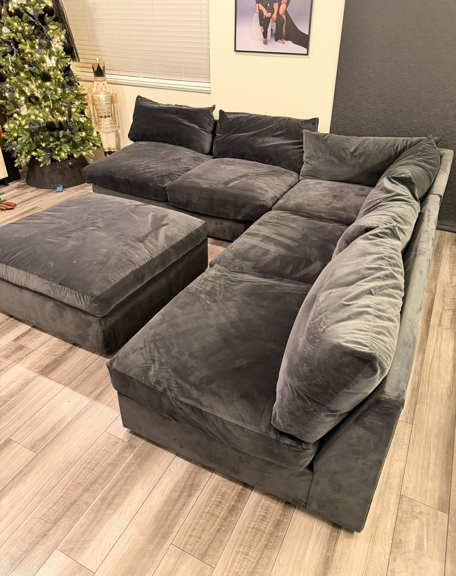 This sectional was about 3k from living spaces This beautiful oversize couch is I believe 96x96 & ottoman is 42 inch’s It’s a comfortable couch all guest fall asleep on them. They do need a cleaning I have someone I can recommend But 2 cushions the zipper broke but it’s not noticeable & if you know a seamstress it can easily be fixed & 1 of the pillows has a corner open that needs to be sewed No smoking 🚭 home