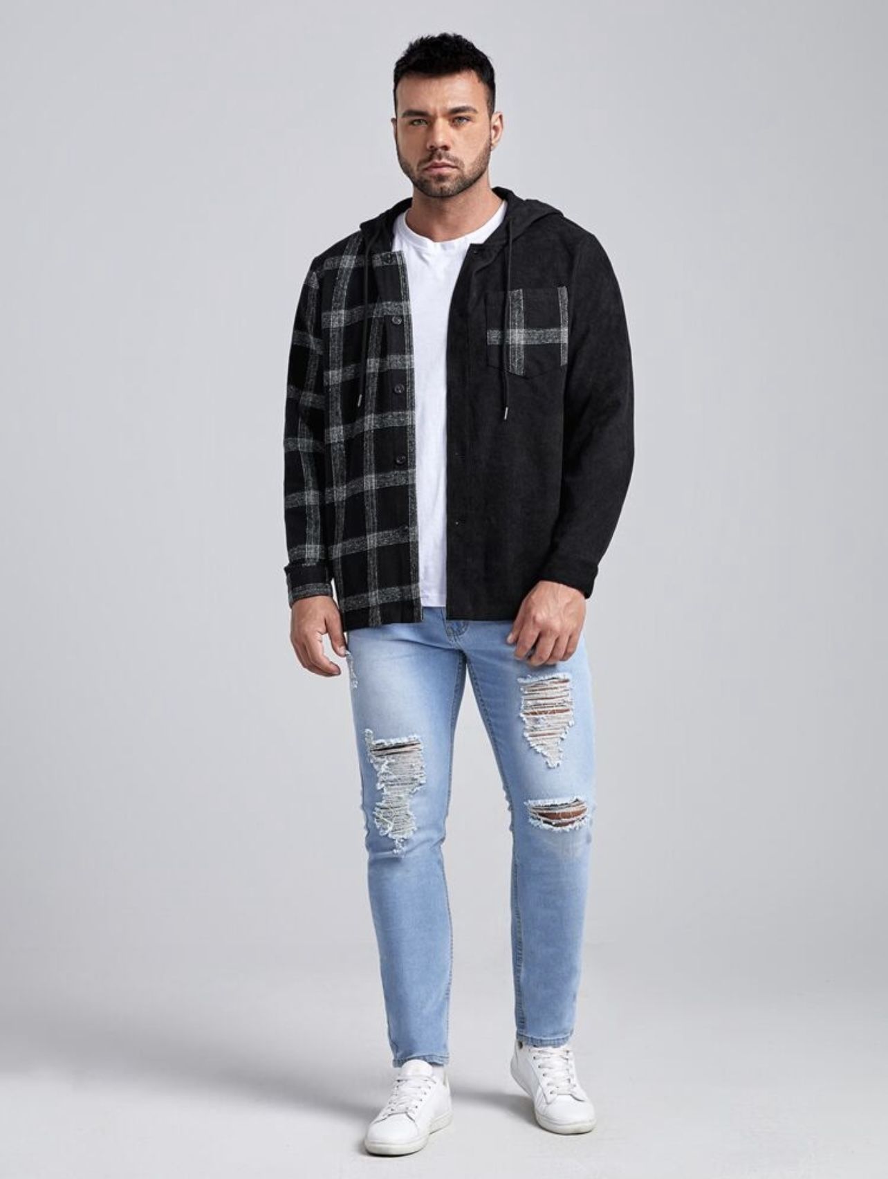 Elevate your wardrobe with this distinguished Manfinity Plus Plaid Paneled Hooded Jacket, meticulously designed for men who value comfort without compromising on style. Crafted in a versatile US-3XL (EU-5XL) size, this jacket exudes a modern, casual sophistication. Tailored to perfection, it features a hooded neckline and regular long sleeves, offering a laid-back yet polished aesthetic. Product Highlights: • Design Details: A classic plaid paneling paired with a sleek black base, enhanced with thoughtful accents such as a functional chest pocket, adjustable drawstring hood, and a stylish button-front placket. • Material Composition: Made from a premium corduroy blend of 97% polyester and 3% elastane, ensuring softness and durability with a smooth, non-stretch fabric that holds its shape beautifully. • Fit: The regular fit combines comfort with a flattering silhouette, ideal for layering during cooler months or as a statement piece. Measurements: • Shoulder: 23 inches • Bust: 59.4 inches • Sleeve Length: 26.9 inches • Length: 32.3 inches • Cuff: 12.6 inches Designed for a seamless transition from day to evening wear, this jacket’s single-breasted placket, plaid pattern, and casual yet refined vibe make it an essential piece in any wardrobe. From outdoor strolls to relaxed outings, this jacket retains its like-new look and feel, ensuring you exude confidence and effortless style.