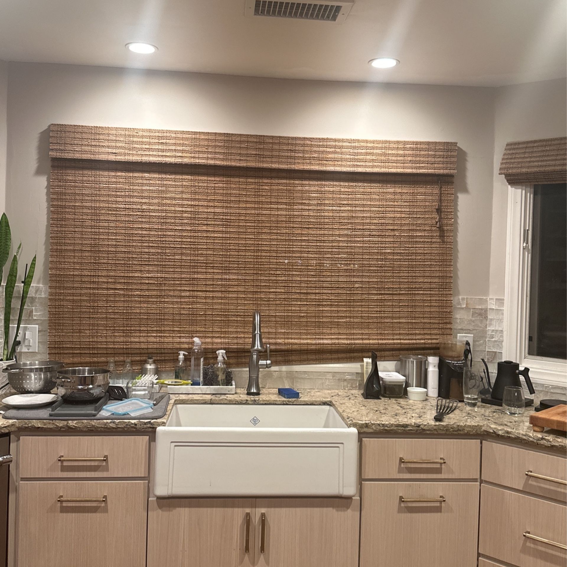 Matching Roman pull string shades, like new, three of them. Excellent condition. The Measurements are: The middle blind is: 76”w 46”h The two blinds on each side are: 40”w 46”h We are remodeling our kitchen and changing the color scheme. Pickup in Calabasas. Cash, Zelle or Venmo please. :) Let me know if you have any questions.