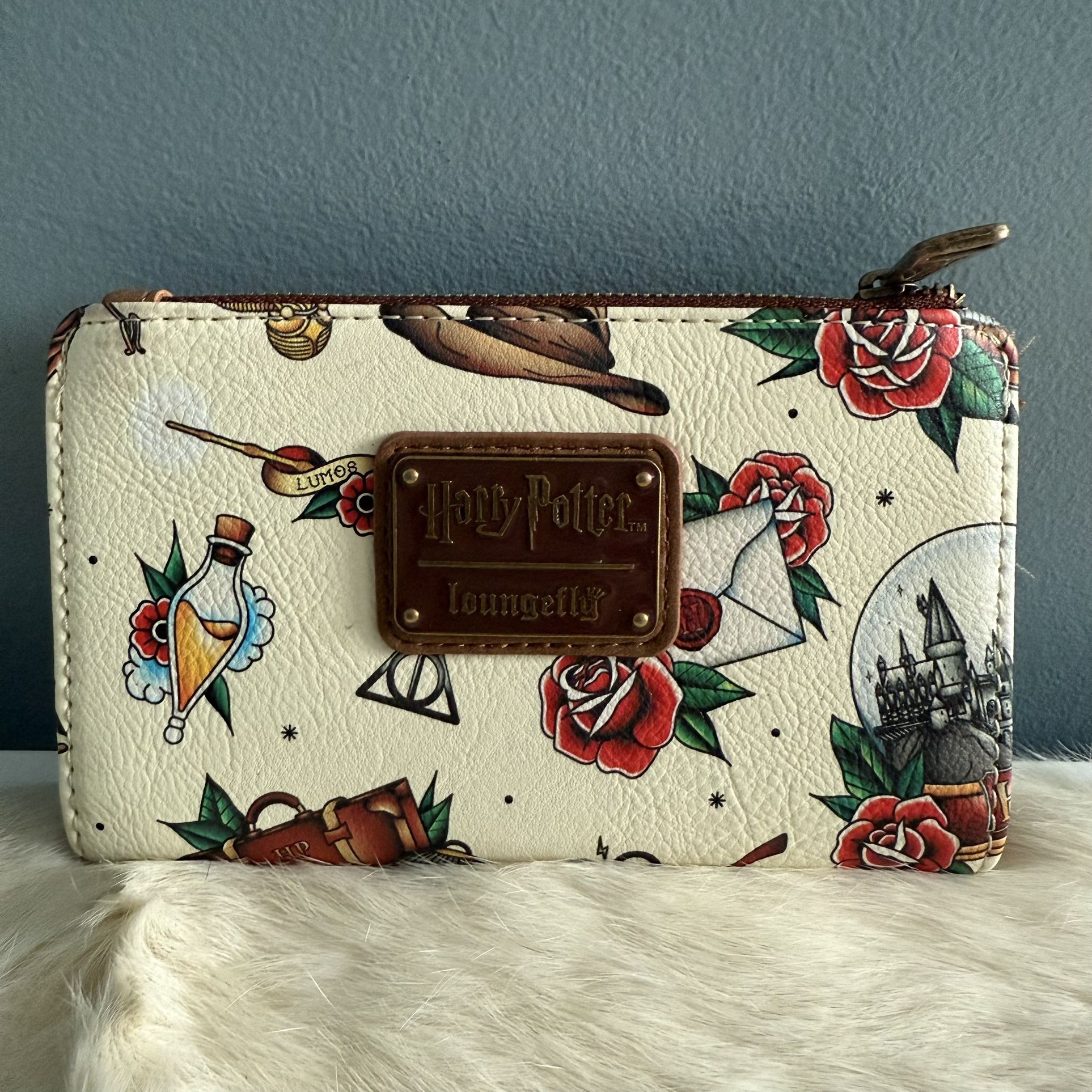 Loungefly x Harry Potter Tattoo All Over Print Bifold Wallet. 8 card slots, bill slot, zippered coin pouch and ID window. Measures approximately 6.5”W x 4”H. Small light mark on front and back as seen in photos, otherwise like new condition.