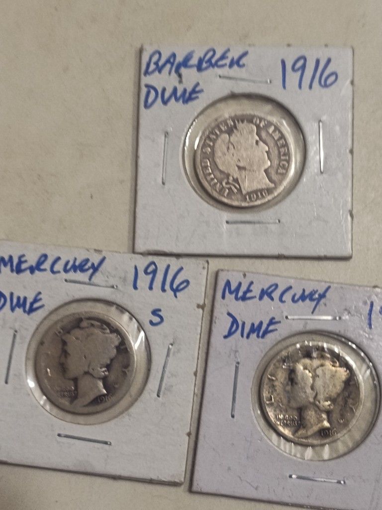 1916,1916S mercury and 1916 barber dimes Very good condition
