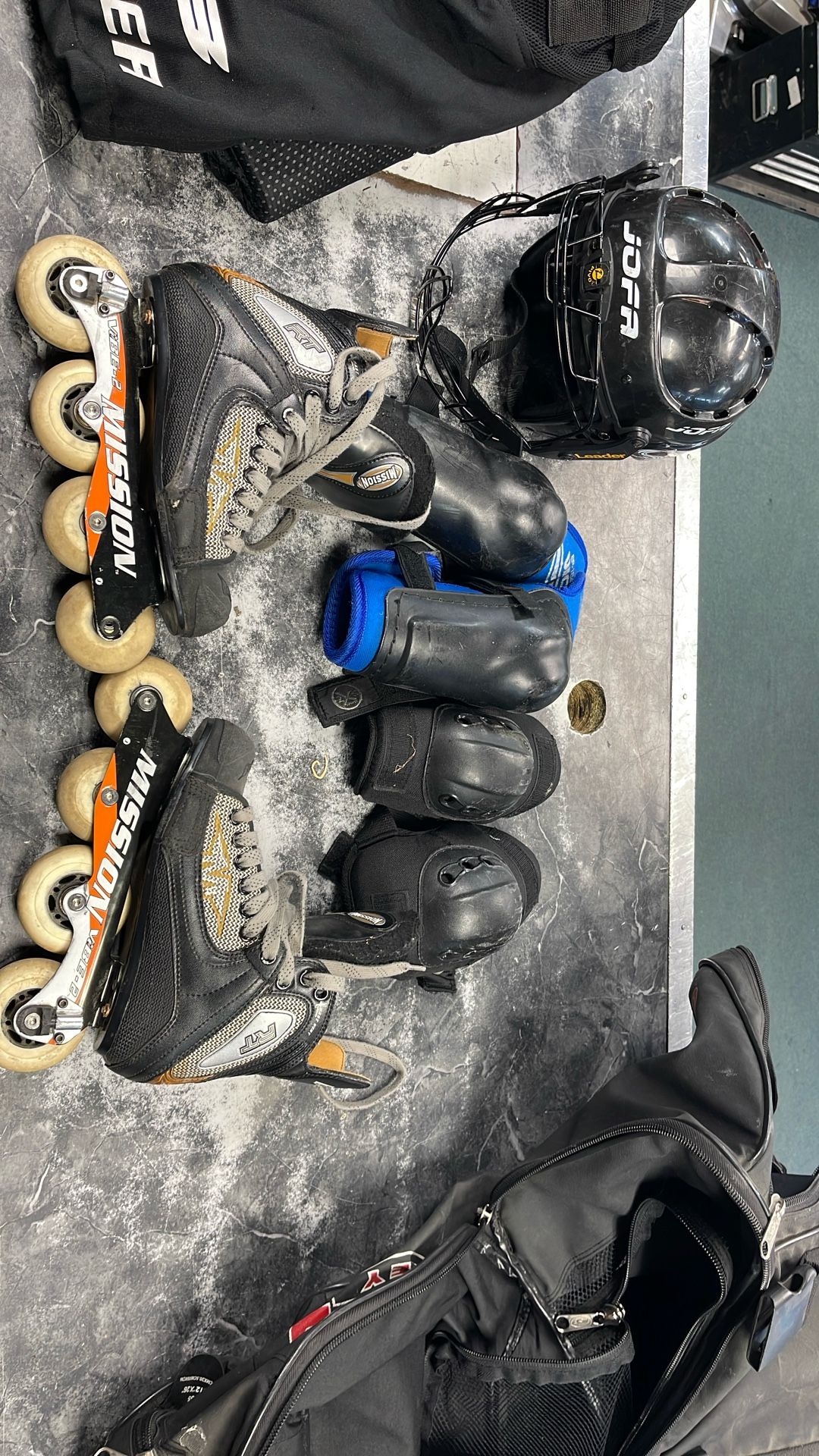 Hockey Gear Roller Blades, Pads, Helmet, Pants Leggings, Elbow & Knee Backpack