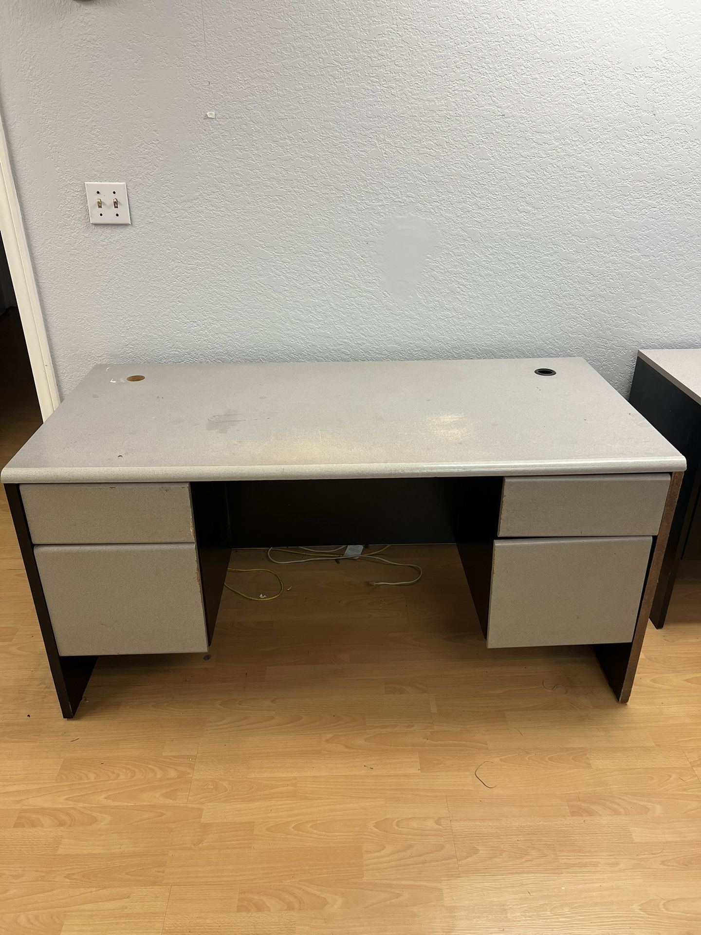 Computer desk for sale. This desk is made from sturdy MDF wood with laminate finish in gray and black. There are 4 drawers, 2 on each side, that old files as well as other office supplies. The top has 2 holes for cables. Approximate measurements are: Length: 59.5" Width: 29.5" Height: 29" The desk is in good condition, with some cosmetic wear on the top as well as the edges (pictured). Although there is natural wear from use, this heavy desk was made to last and is efficient for completing any office task. I also have another slimmer one available in the same style and color. Cash only, pick-up only. Please bring help to transport since this is heavy. For any questions, please send me a message. Thank you!