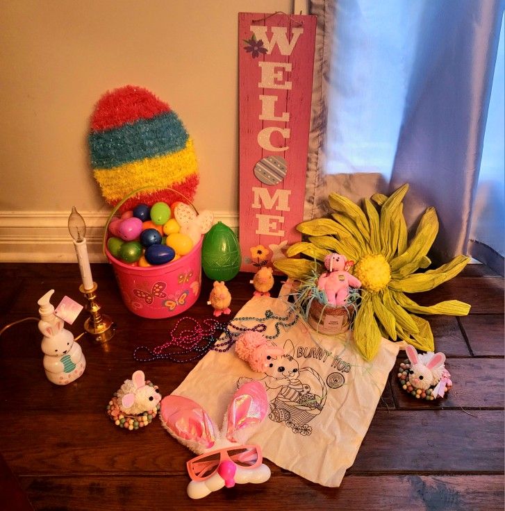Easter decorations bundle includes 50 plastic eggs New hand soap Plastic bucket Electric candles Easter bag Plastic eggs decore Green paper flower Bunny glasses 2x small stuffed animal bunnies 2x walking chickens Some beads 3x small decoration bunnies Decorations sign Yorkville pick up near Kennedy rd and Bristol Ridge rd in Grand Reserve neighborhood close to Orchard rd and rte34.check my other Easter decorations. Price is for everything.smoke free home and pets free. If still posted then still available
