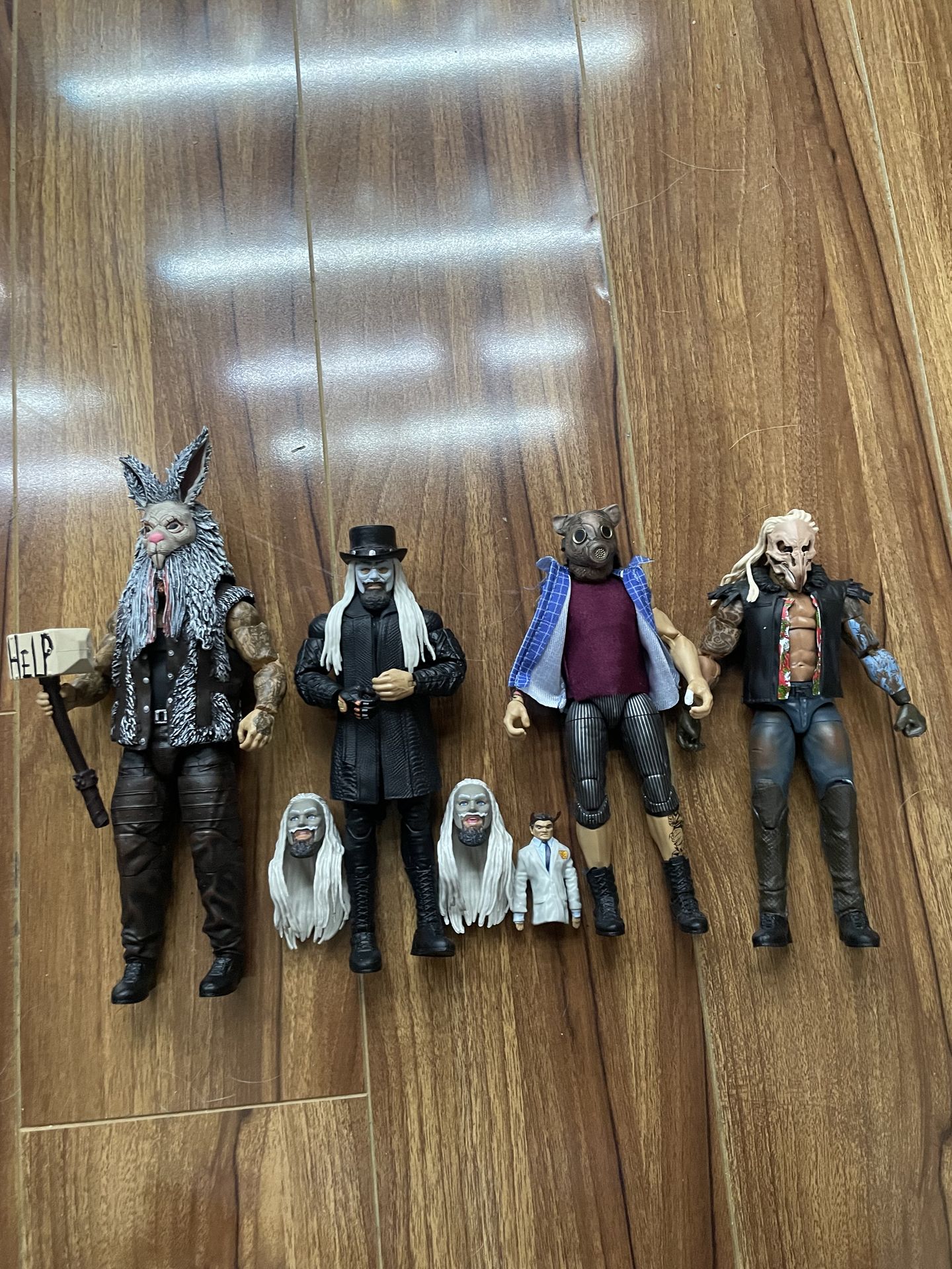 Price is for all Uncle howdy from 3 pack elite with two head scans from the Ultimate a vince McMahon puppet accessory from bray Wyatt figure Rowan from 3 pack Dexter Lumis and Joe gacy all in new shape only been on display Trades wise i would trade all for two ljn stone cold Steve Austin’s a black card and a blue card
