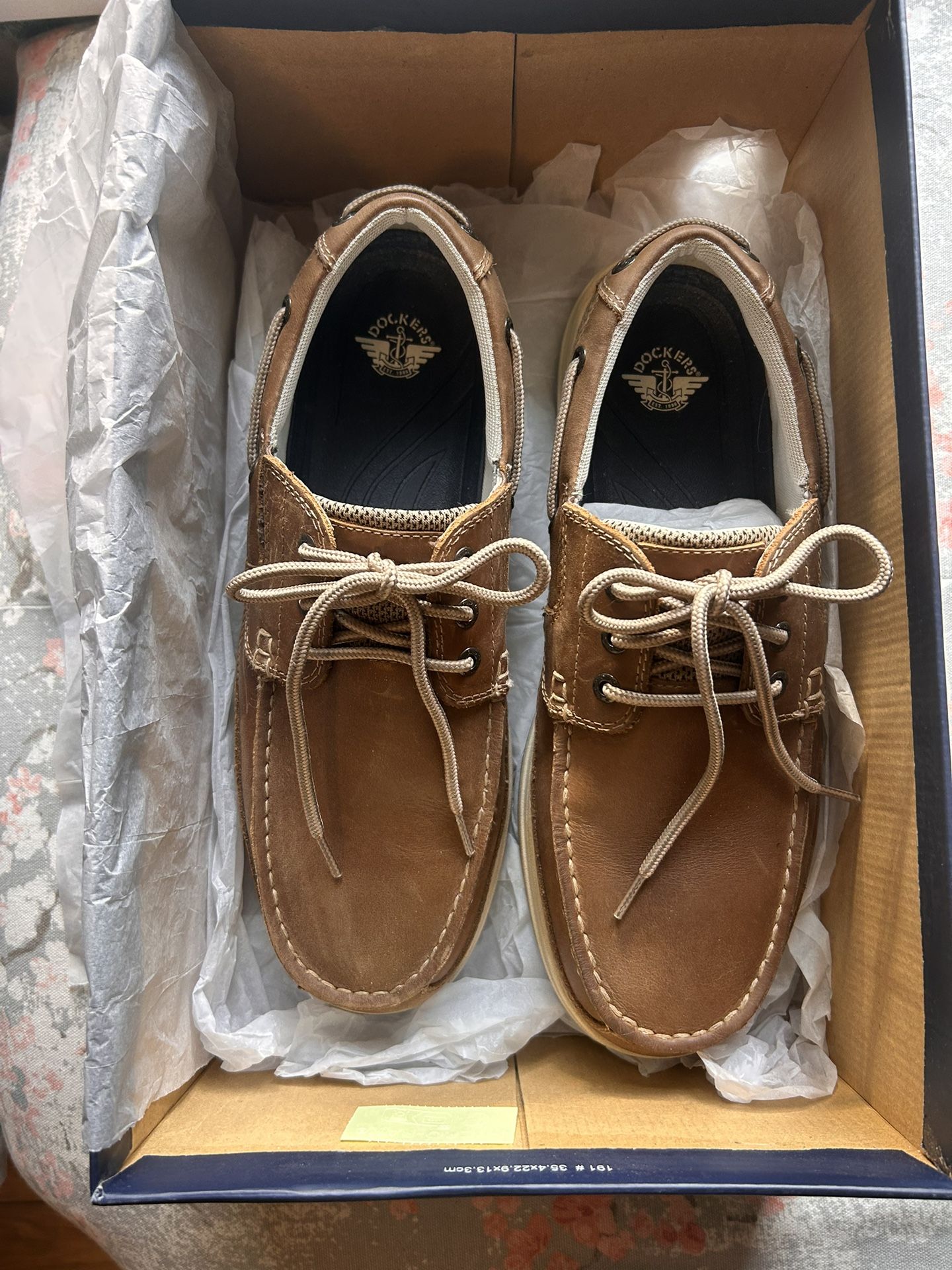 Brand new, dark tan leather, size 10.5 Wide shoes. Orig price is $80. Didn't work for my grandpa.