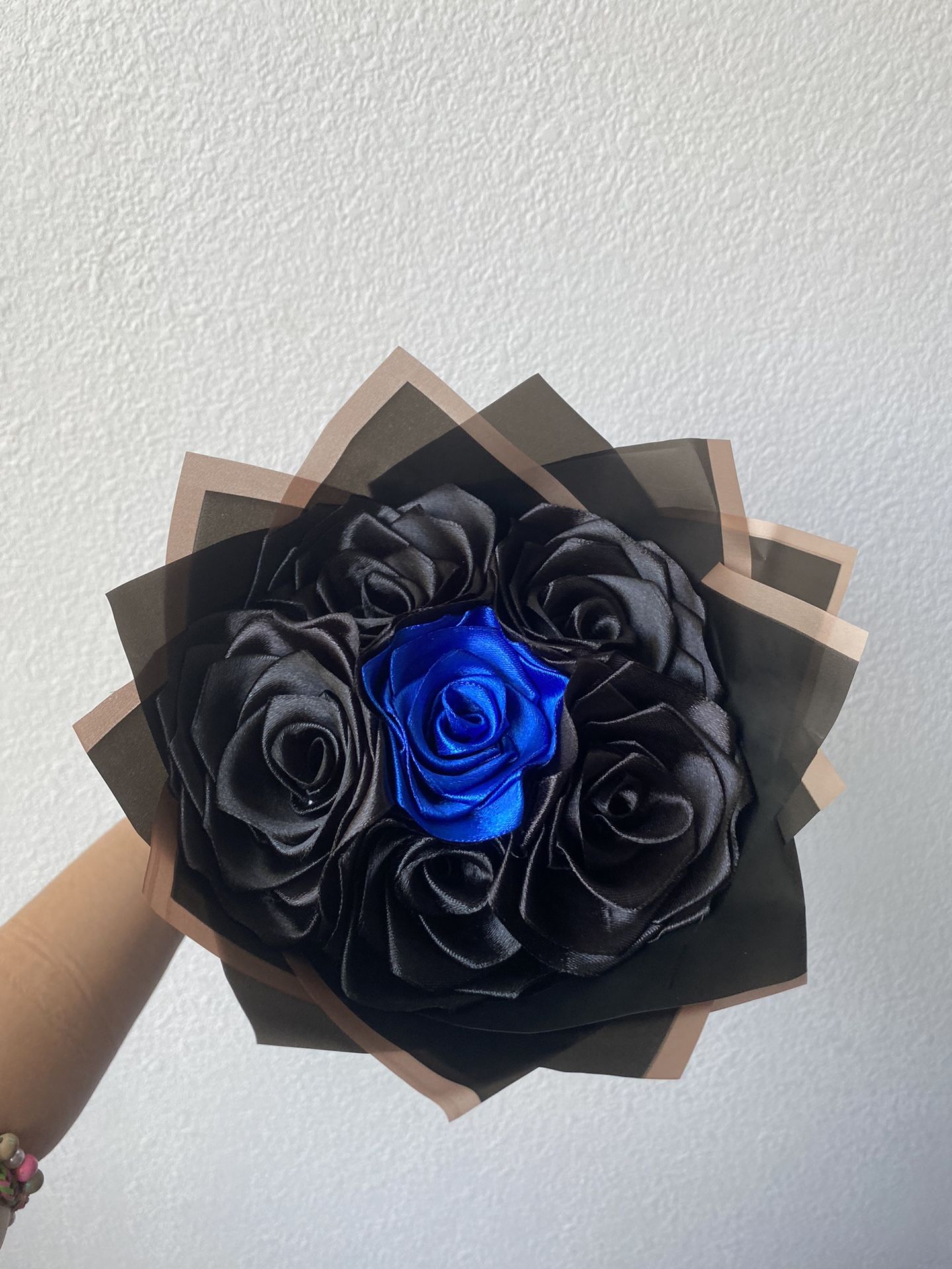 Eternal Ribbon roses Bouquets all black one blue rose, black wrap, blue bow. Also taking orders if wanted a bigger count of roses or a different styles, and color roses. Also Mother’s Day orders @ I.E.Eternal.Bouquets on insta