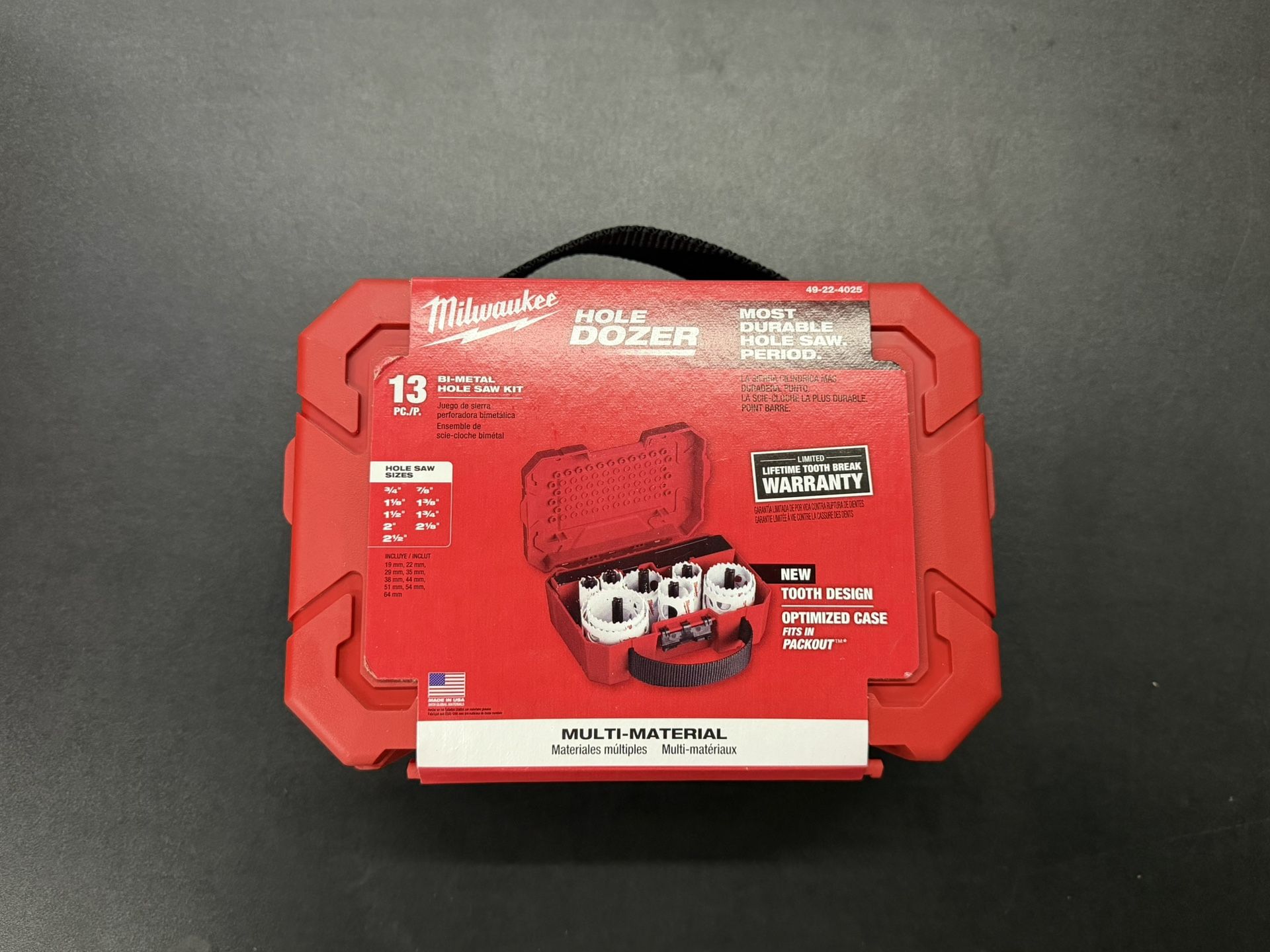Brand new, sealed Milwaukee home dozer general purpose bi-metal hole saw set 13-piece Saw blades in 9 sizes: - 3/4, 7/8, 1-1/8, 1-3/8, 1-1/2, 1-3/4, 2, 2-1/8, 2-1/2in