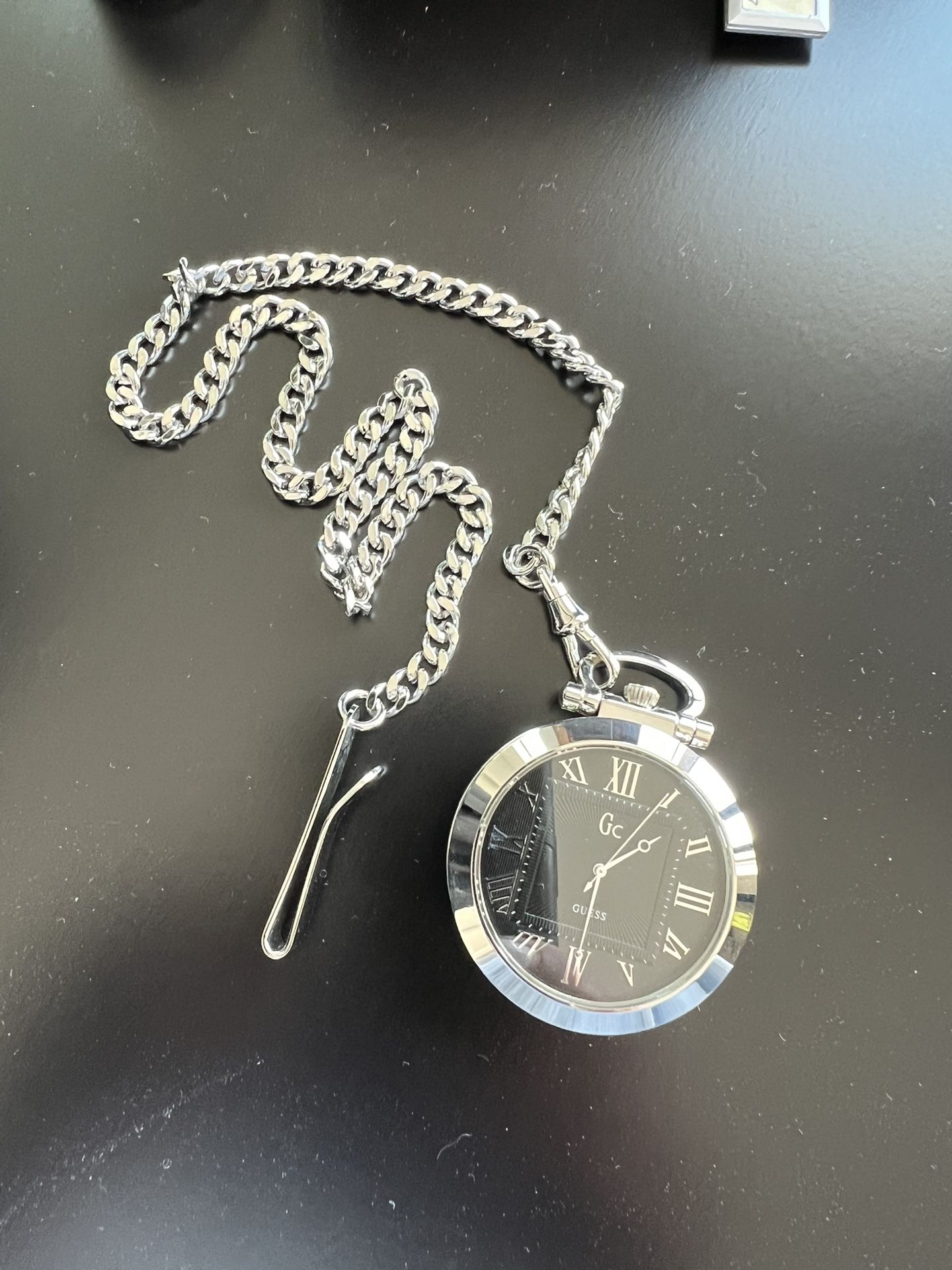 NWT style G15072 Pocket Watch with black dial Roman numerals . Substantial piece. Limited edition Japanese movement textured bezel Also has a back stand can be used as mini clock( dual purpose) Original price $1500 Box tags and carry pouch