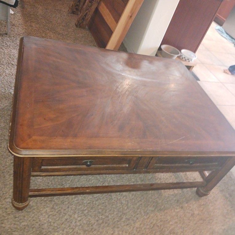 Solid heavy duty wooden coffee table with 2 drawers asking $60 cash must pick up Broadway and apache buckeye az size is 40inx50in and 20in tall has some marks but overall great shape can help load