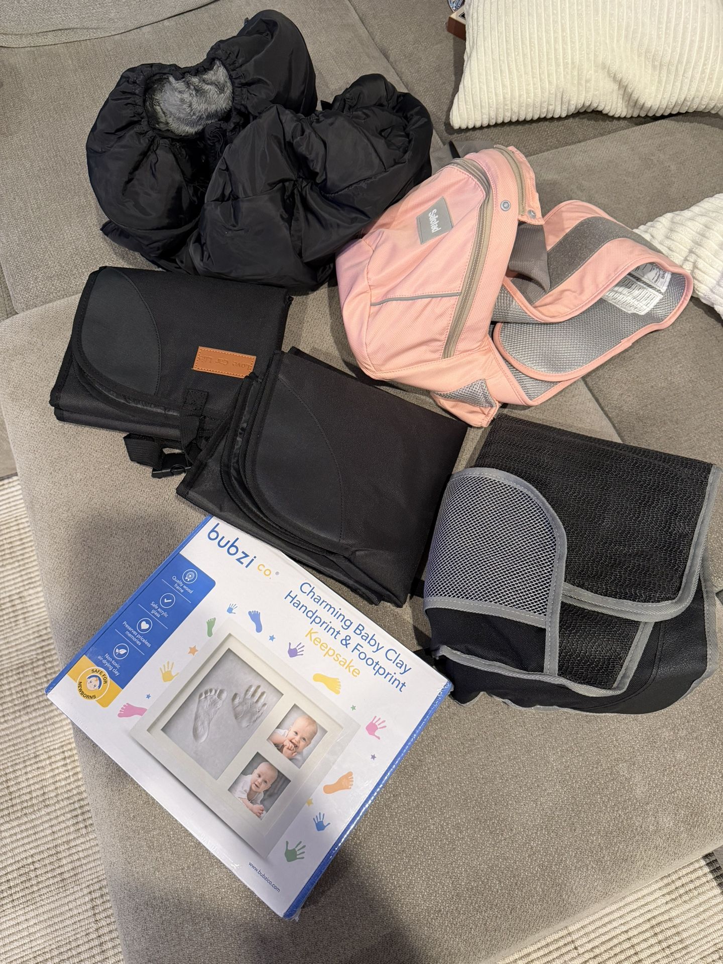 Brand new sealed bubzi handprint and footprint keepsake. Two brand new love car life car seat protector. One used car seat protector. One lightly used pink hip baby carrier. One open but never used orzbow car seat rain / cold cover. Items are in good condition. Just don’t need anymore. One price gets you all items. Not selling individually.