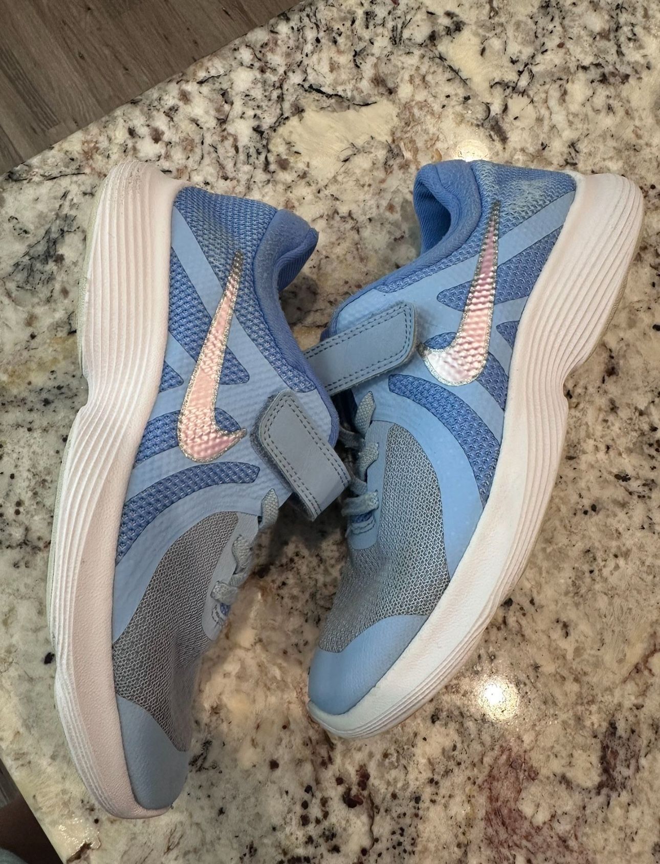 Little Girls Nike Shoes! (Size 3Y) Baby blue, white and pink logo. Slip on with velcro. In good condition.