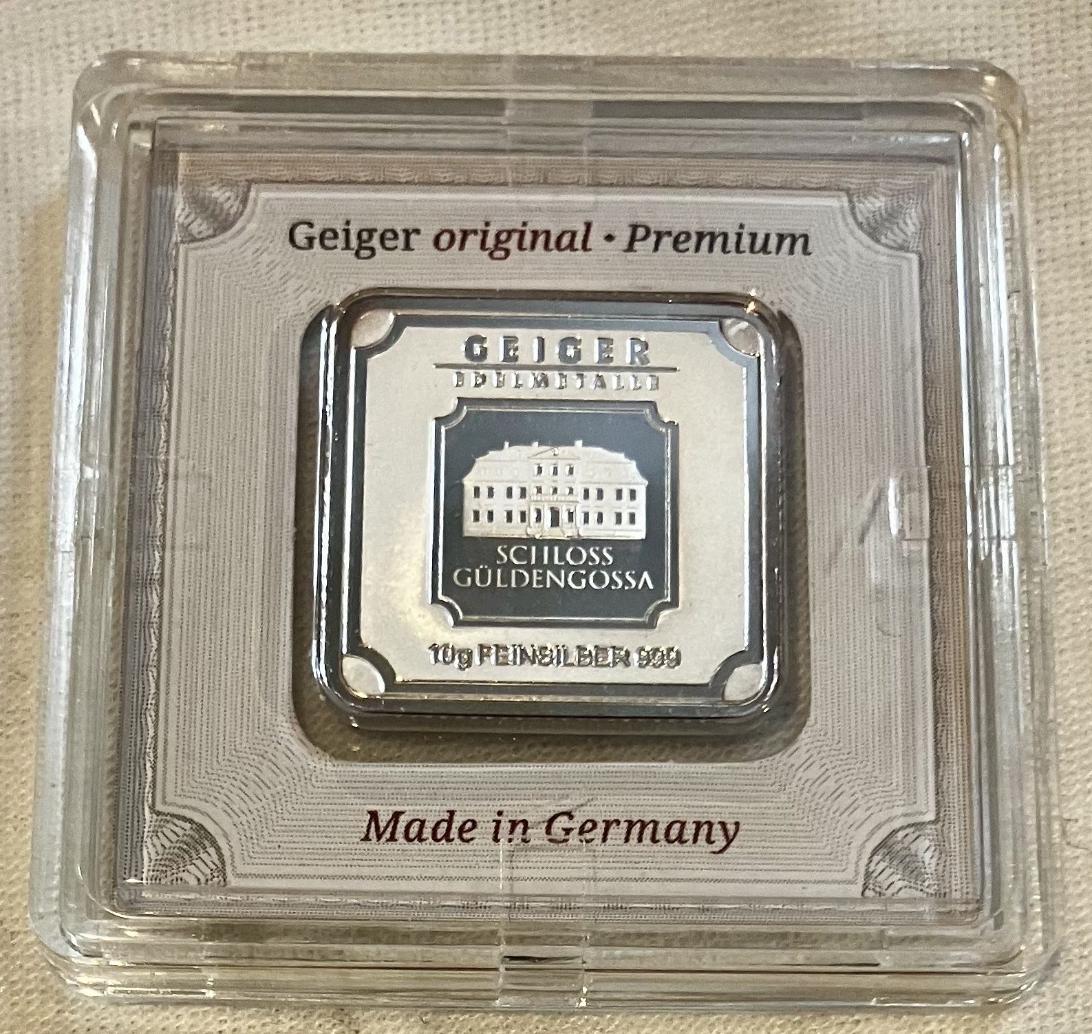 10 gram 999 fine silver square bar by Geiger Edelmetalle. Please read the entire listing before responding. Price is Firm, Cash Only, no trades, no bulk deals and I do not ship as I am a collector, not a dealer; I purchased my collection piece by piece. Always kept in a secure and controlled environment which will require at least one business day to retrieve for showing or additional pictures. Local Pickup Only in Creedmoor most evenings and weekends, or SE Cary weekdays (lunchtime slot preferred). Crabtree Mall could be an option during the evening commute most weeknights. Serious inquiries only. Canned responses like “is this still available” will be ignored and/or blocked as will ridiculous offers and comments. Please don’t waste my time by wasting your own. If the listing is up and not pending, it’s available.