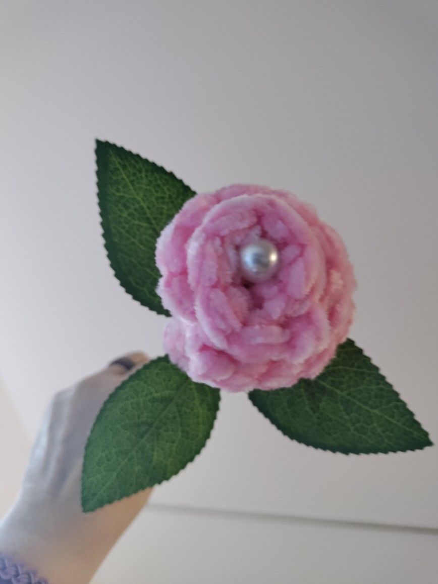 Handmade with super soft Chenille yarn, rose leaves, and an accent pearl. Can be made without leaves and pearls, if requested. I will also wrap the roses in wrap and ribbon, if requested.