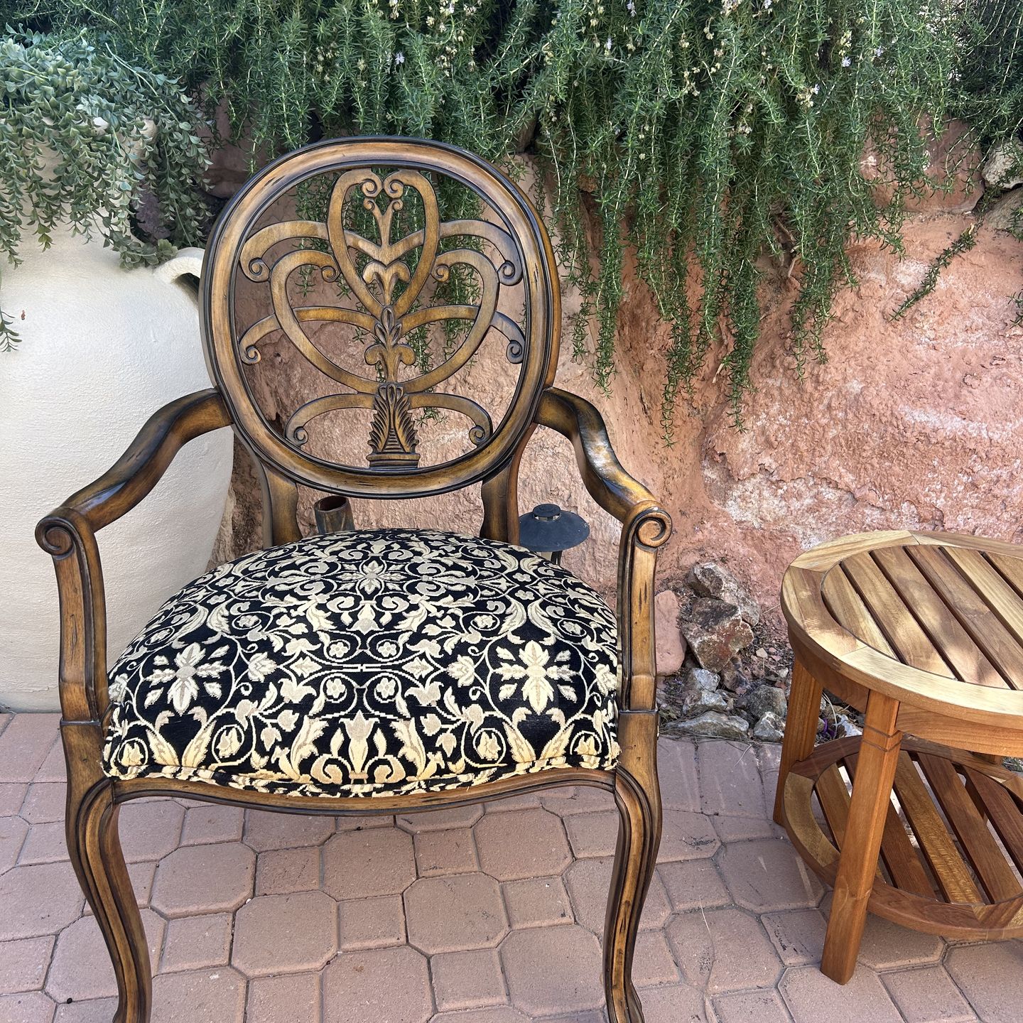 Gorgeous Hepplewhite-Style Ornate Wood Armchair Black & Gold Pattern Upholstery