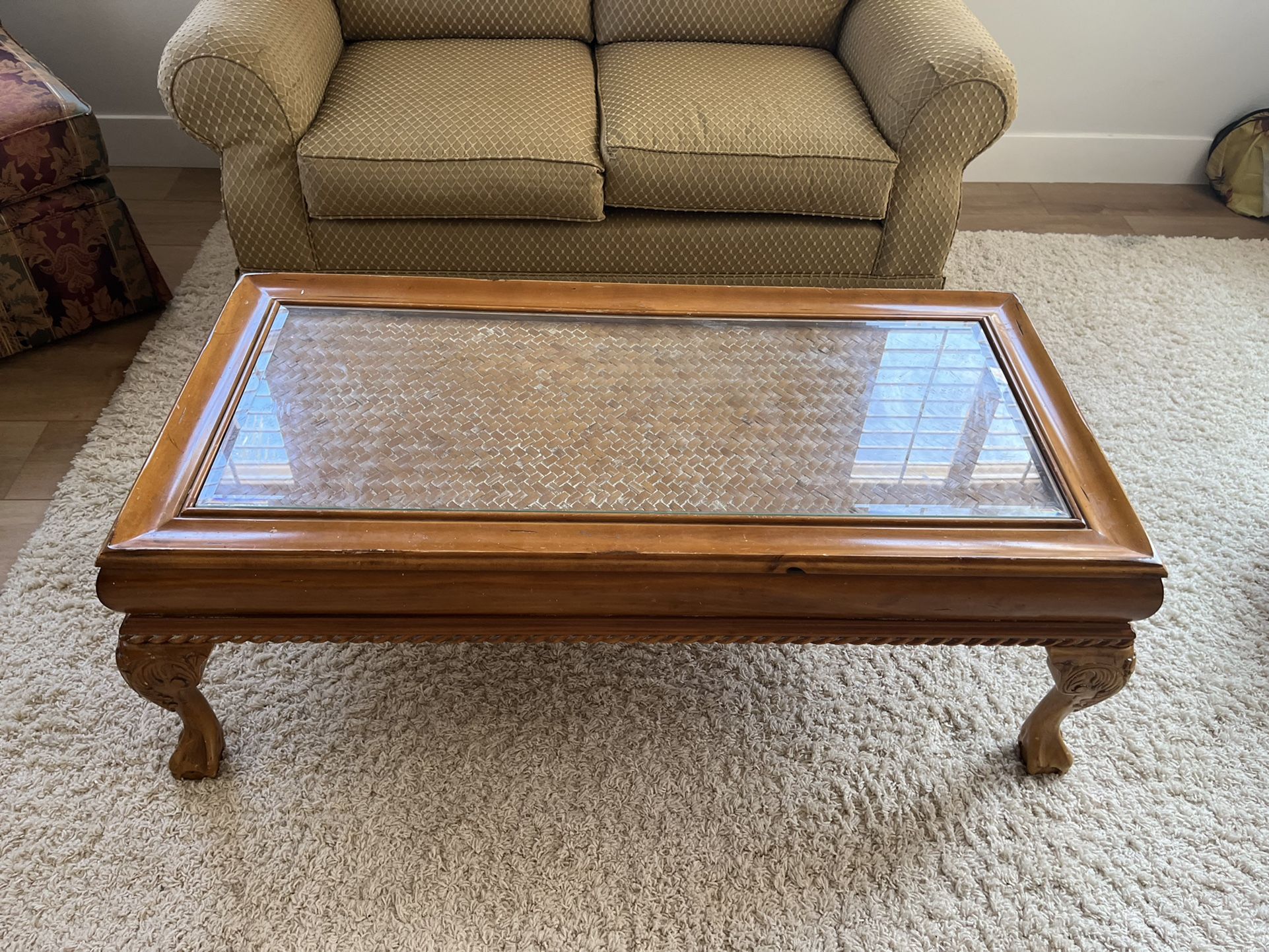 Formal living room furniture in good condition. Sofa has no rips or stains could use a cleaning but otherwise looks beautiful. The two darker wood coffee tables each have a small blemish but not very noticeable. The furniture is high quality solid wood Buy them all together and save. They are also listed separately WINNER TAKES ALL