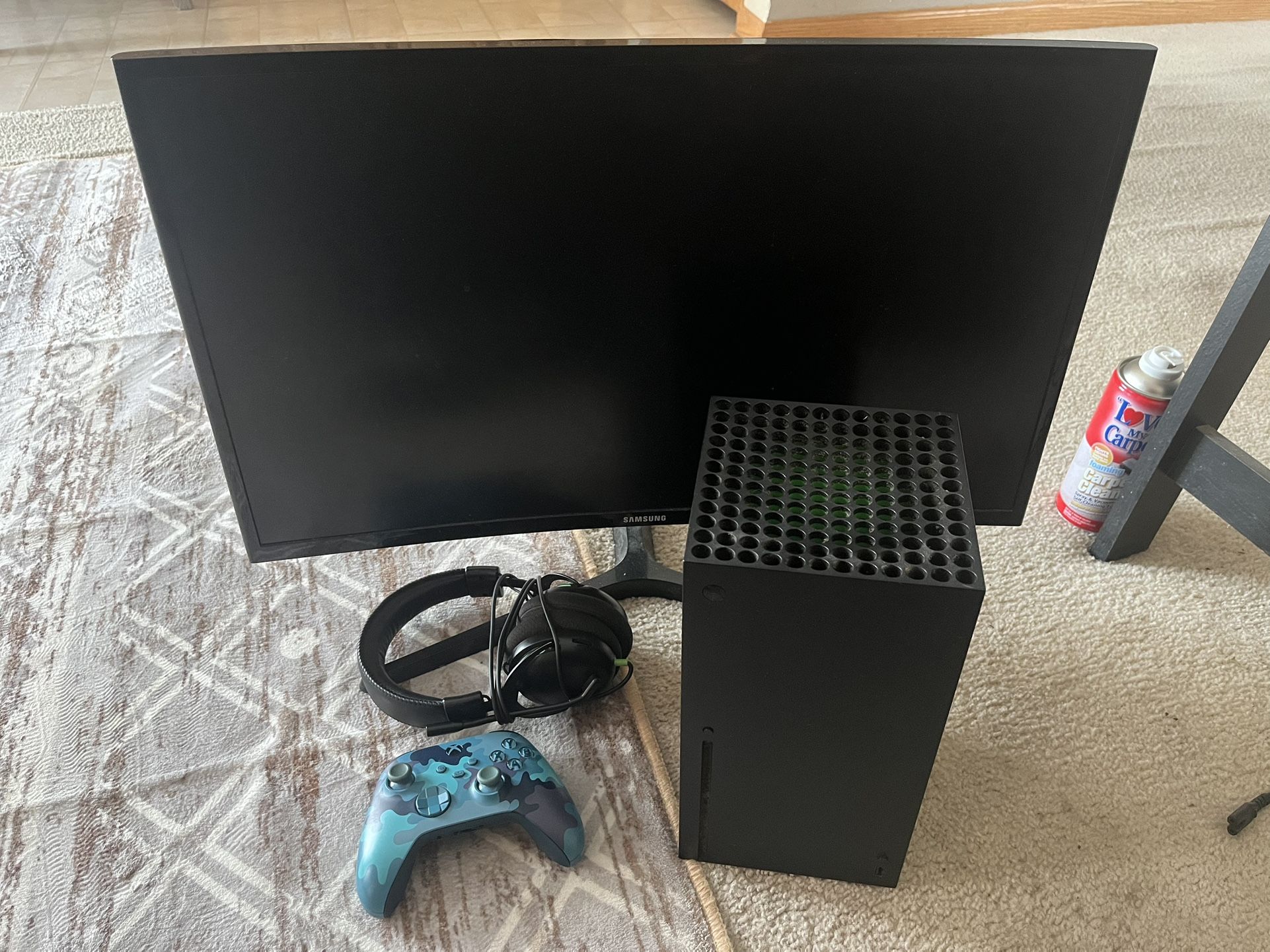 Selling my full Xbox Series X gaming setup. Everything works perfect and is clean. No issues at all. Includes: • Xbox Series X console (good condition, runs smooth) • Samsung 17” monitor (paid $200 new) • 1 wireless controller (camo design) • Gaming headset • HDMI cable + power cables included