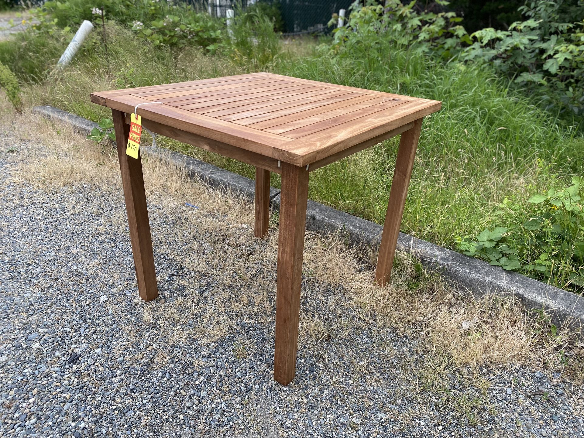 Beautiful and sturdy teak bistro table perfect for dining! Enjoy the sunset and a meal on your deck or in your garden. 32” square top x 30” high $150 (plus tax) Same day pickup in Tacoma