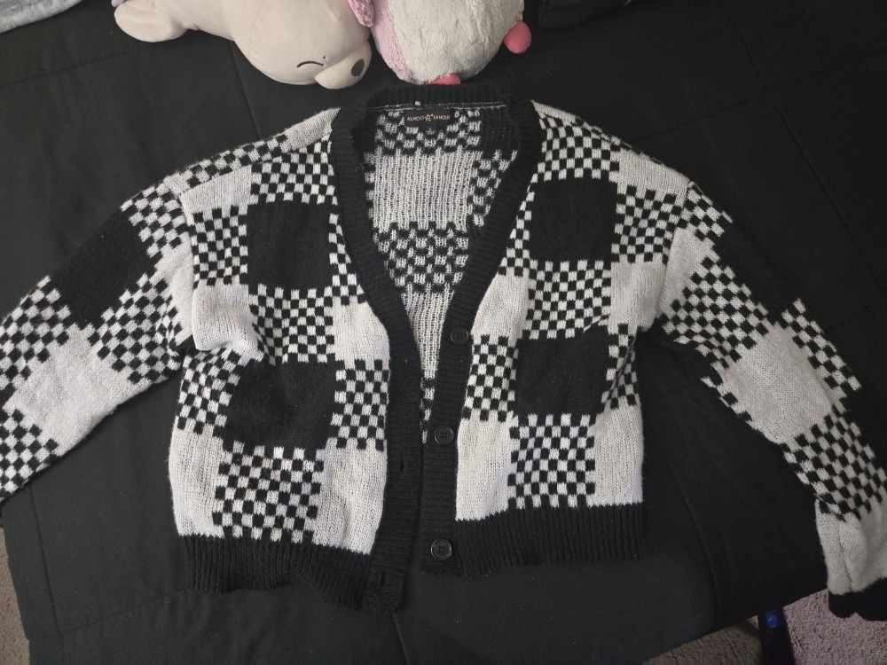Chic knit cardigan with a monochrome pattern. Features a classic button-up style. I remember getting it at forever 21