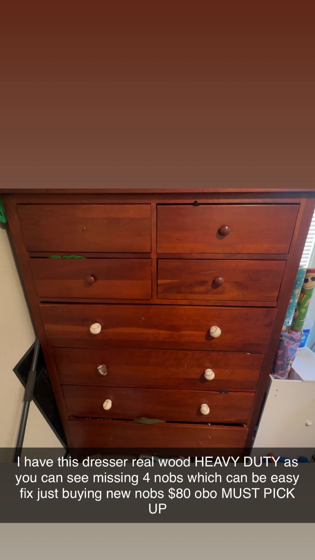 Gently used good condition Sturdy Heavy All wood 8 draw dresser only missing 3 knobs (which can be easy fix) $80 obo