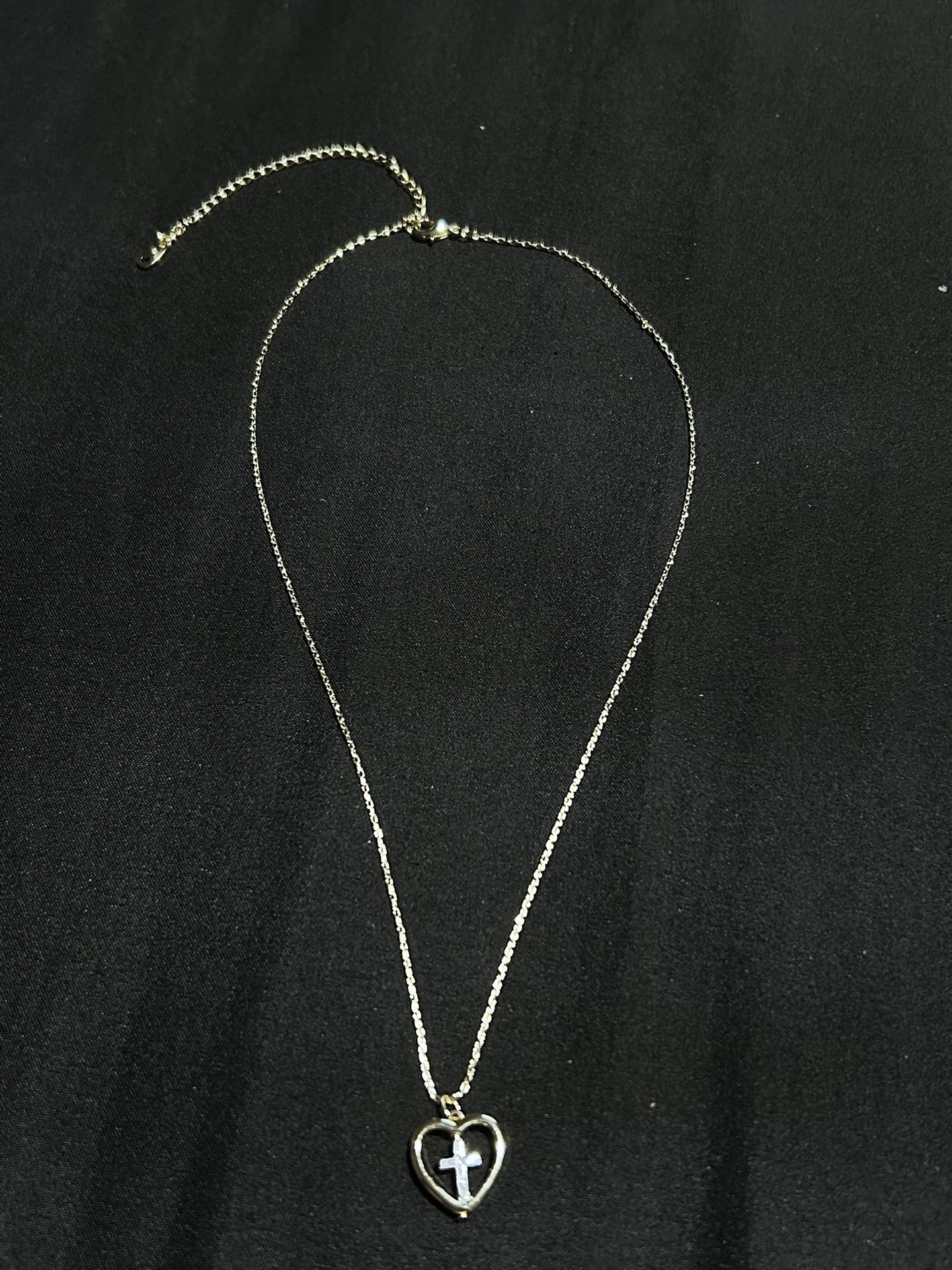 This is a two-tone heart and cross pendant necklace made of copper.