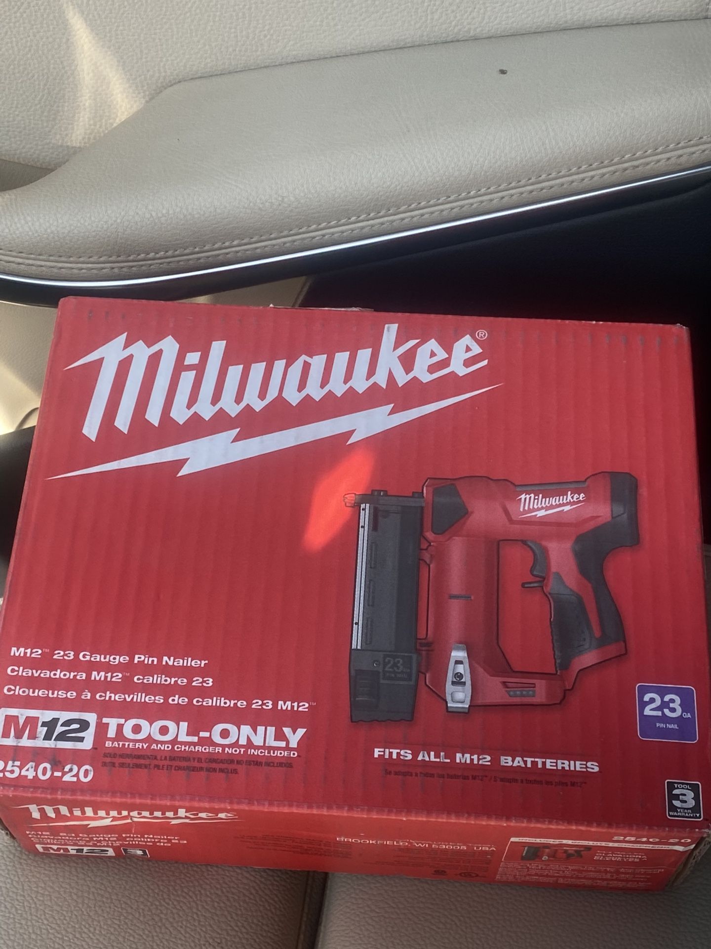New in box never opened. Retail $250 Save save save. Full details below Model#: 2540-20 Sku#: 100(contact info removed) Internet#: (contact info removed)00 The MILWAUKEE M12 23 Gauge Pin Nailer is the most compact cordless pin nailer, combining precision and power to deliver the performance that professional carpenters and remodelers demand, without the hassle of a compressor hose or gas cartridge. The 23 gauge pin nailer provides users with unmatched productivity and accessibility in tight spaces and confined corners with a lightweight, ergonomic design. The nitrogen air spring mechanism allows the nailer to consistently sink pin nails at proper depth into hard or softwoods while leaving small, clean nail holes. The double-action trigger and non-marring precision point tip allow users to perform sequential driving and accurate pin placement into delicate trim pieces. The dry-fire lockout feature prevents misfires and workpiece damage. The M12 Pin Nailer drives 23-gauge headless pin nails ranging in length from 1/2" to 1-3/8" and features all-day run time with up to 750 pin nails per charge when paired with an M12 REDLITHIUM CP1.5 battery pack. This battery-powered pin nailer also features a magazine reload indicator, tool-free drive depth adjustment, reversible belt clip, LED light, battery fuel gauge, secondary work contact tip, and carries an industry-leading 5-year limited power tool warranty. Double-action trigger for sequential driving No pneumatic hose or gas cartridge Compatible with 1/2 in. to 1-3/8 in. 23-Gauge headless pin nails Up to 750 pin nails per charge Tool free drive depth adjustment (2) interchangeable, non-marring, precision point tips included Magazine reload indicator and dry fire lockout mechanism LED Light for increased visibility Reversible belt clip Includes: (1) 2540-20 M12 23 Gauge Pin Nailer, (1) Jam Clearing Guide, (1) Secondary Tip Fits all M12 Batteries Includes: (1) 2540-20 M12 23 Gauge Pin Nailer (1) Jam Clearing Guide (1) Secondary Tip