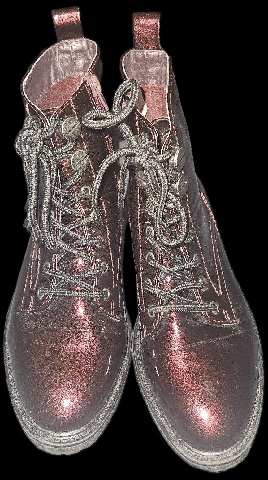True Craft Wine Burgundy Lace Up Patent Leather Combat Boots with Chunky Heel and Sole in Size 8M Wine burgundy shiny faux patent Korri. Laces down the front and side zip for easy slip on. These boots are super cute! And in excellent condition, Barely look worn. Please see all photos for close-ups and detail details