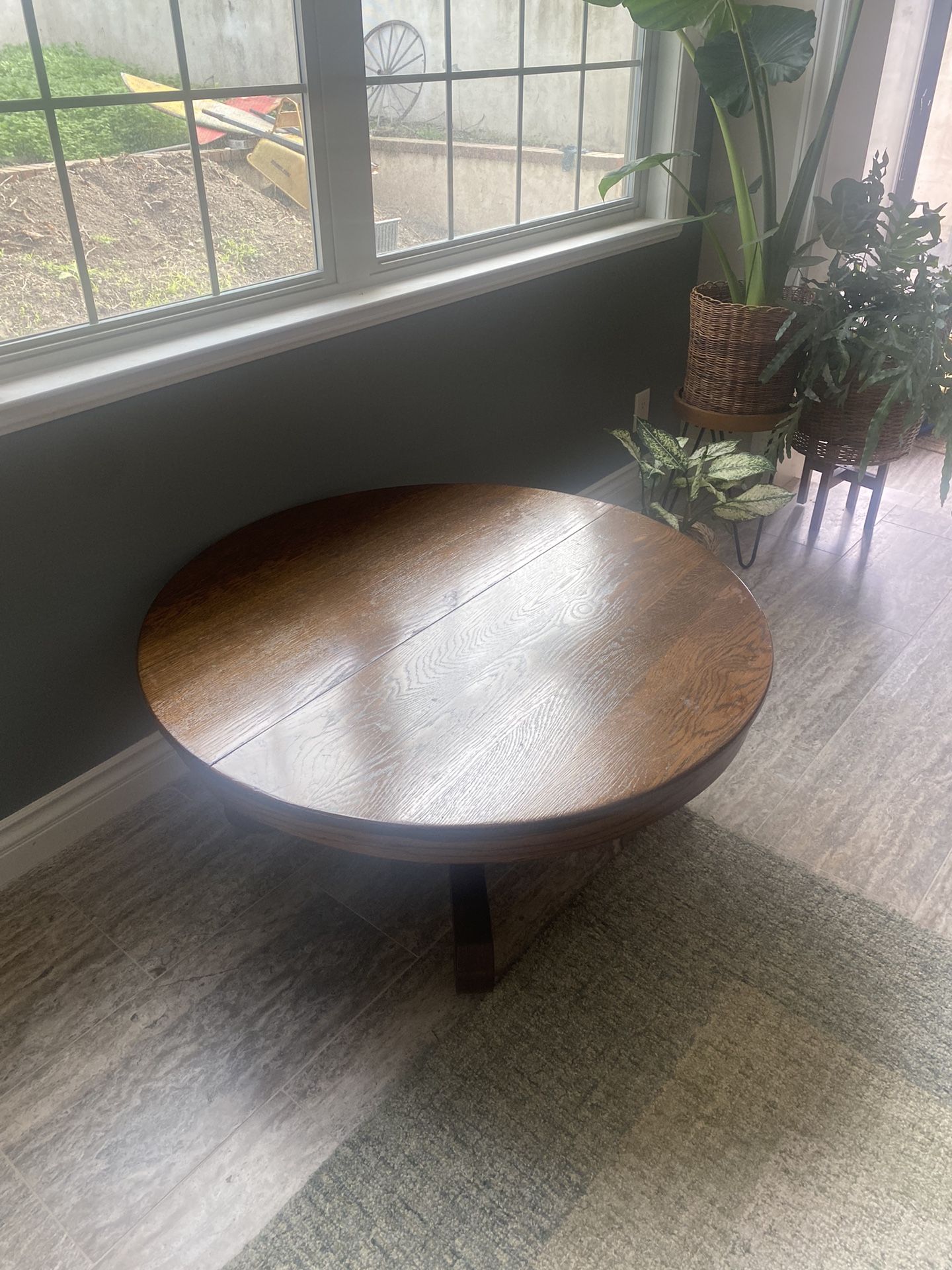 Beautiful round oak table. 42” across, 19 “ high. Classic pedestal style. Very nice condition, see pics. I paid $300 years ago. Best offer brings it home.