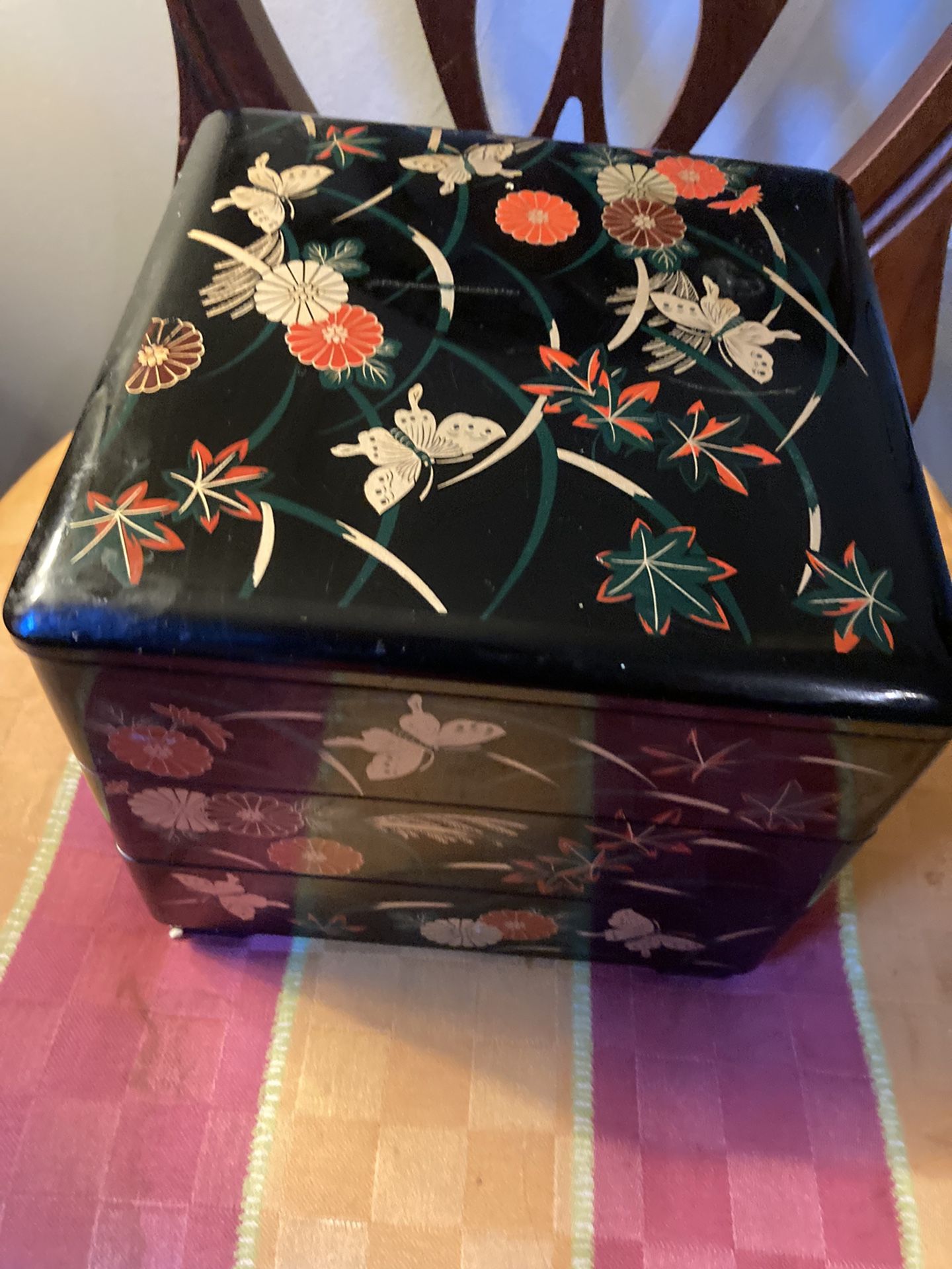 Approximately 6.5” square 5 pieces 3 boxes a stand & a lid outer is black lacquer w/ floral designs inside is plain red lacquer has tiny feet great as a jewelry box etc 1970s-80s era great condition lists for $42