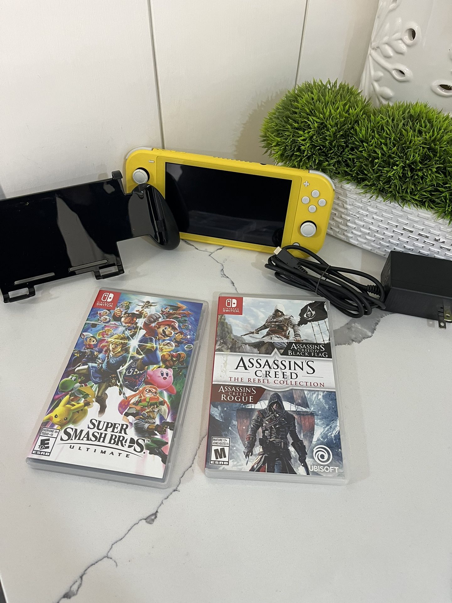 Used a couple of times but never enjoyed. With this bundle you get a yellow switch lite, charger cord, palm fitting attachment for more comfort, 1 Assassins Creed game and 1 Super Smash Bros game. Hopefully you can enjoy what is still a practically new console and games.