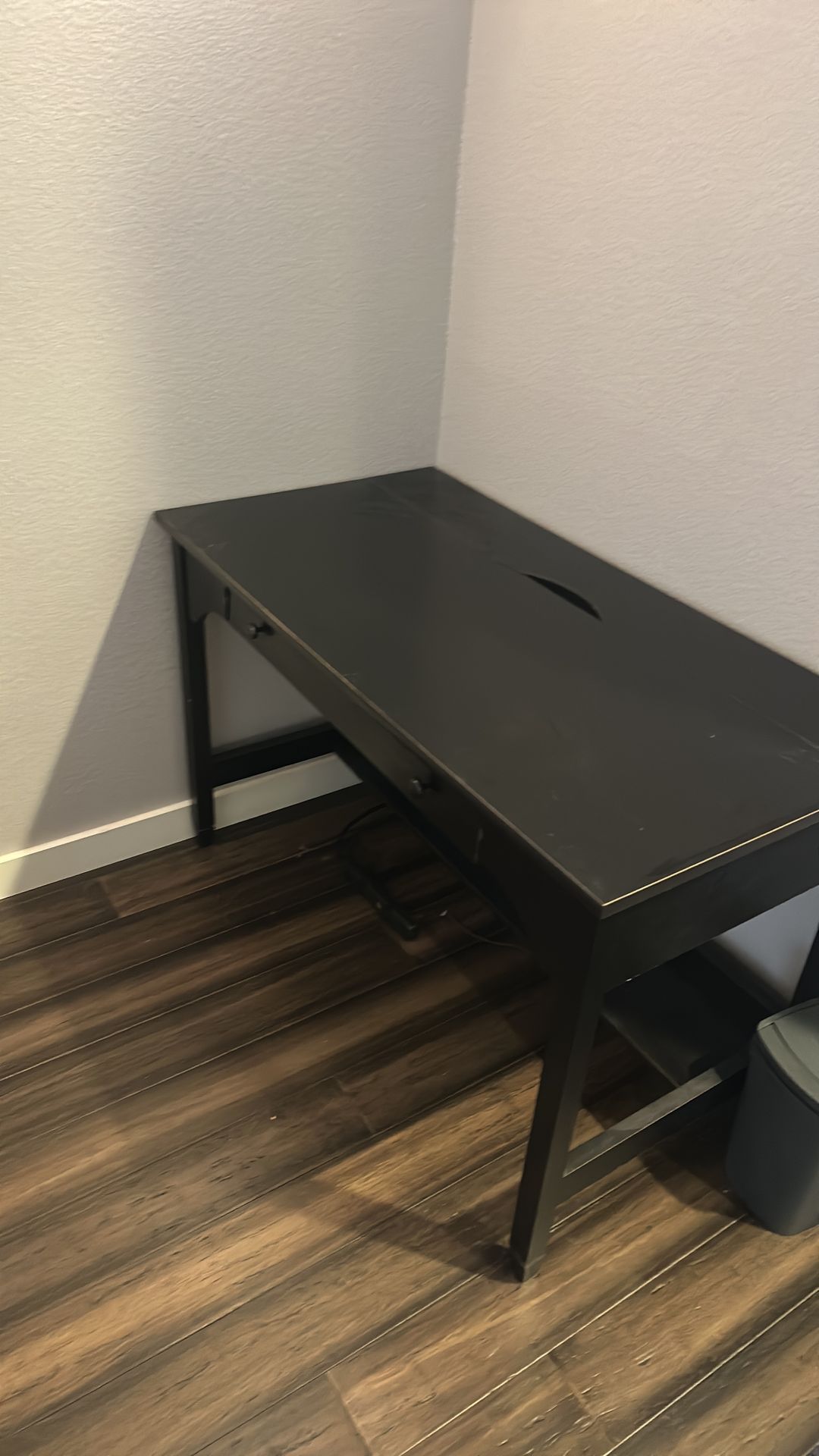Very sturdy and in very good condition. Pull drawer and cable/chord storage 47” wide x 24” deep. Standard height of 30”