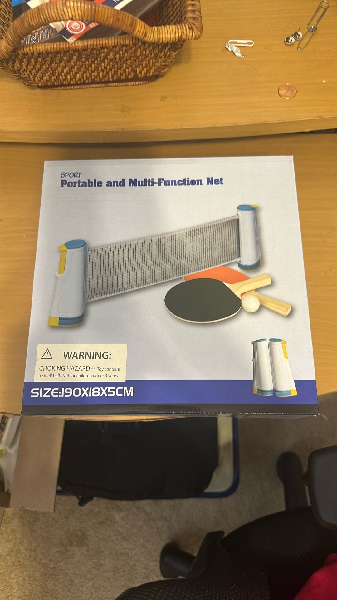 This is a portable and multi-function table tennis net set. It includes a retractable net, paddles, and a ball. The net is designed to be easily set up on various tables, transforming them into a table tennis playing surface. The set is portable and allows for playing table tennis in different locations. The packaging indicates a size of 190x18x5cm and a warning about a choking hazard for children under 3 years old.