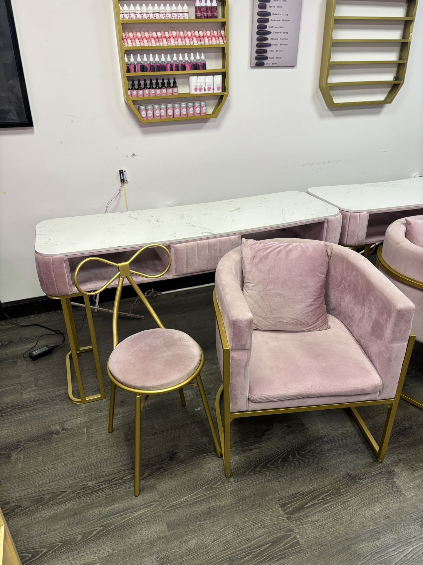 2 Fairly new nail station includes 2 specialist chair, 2 client chair 2 cart, storage available. 2 nail gold metal nail rack not shown in the picture