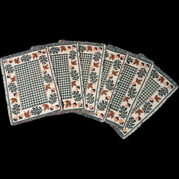 VTG 6 Rust Green Tapestry Plaid Leaves & Acorns Fringed Rectangular Placemats
