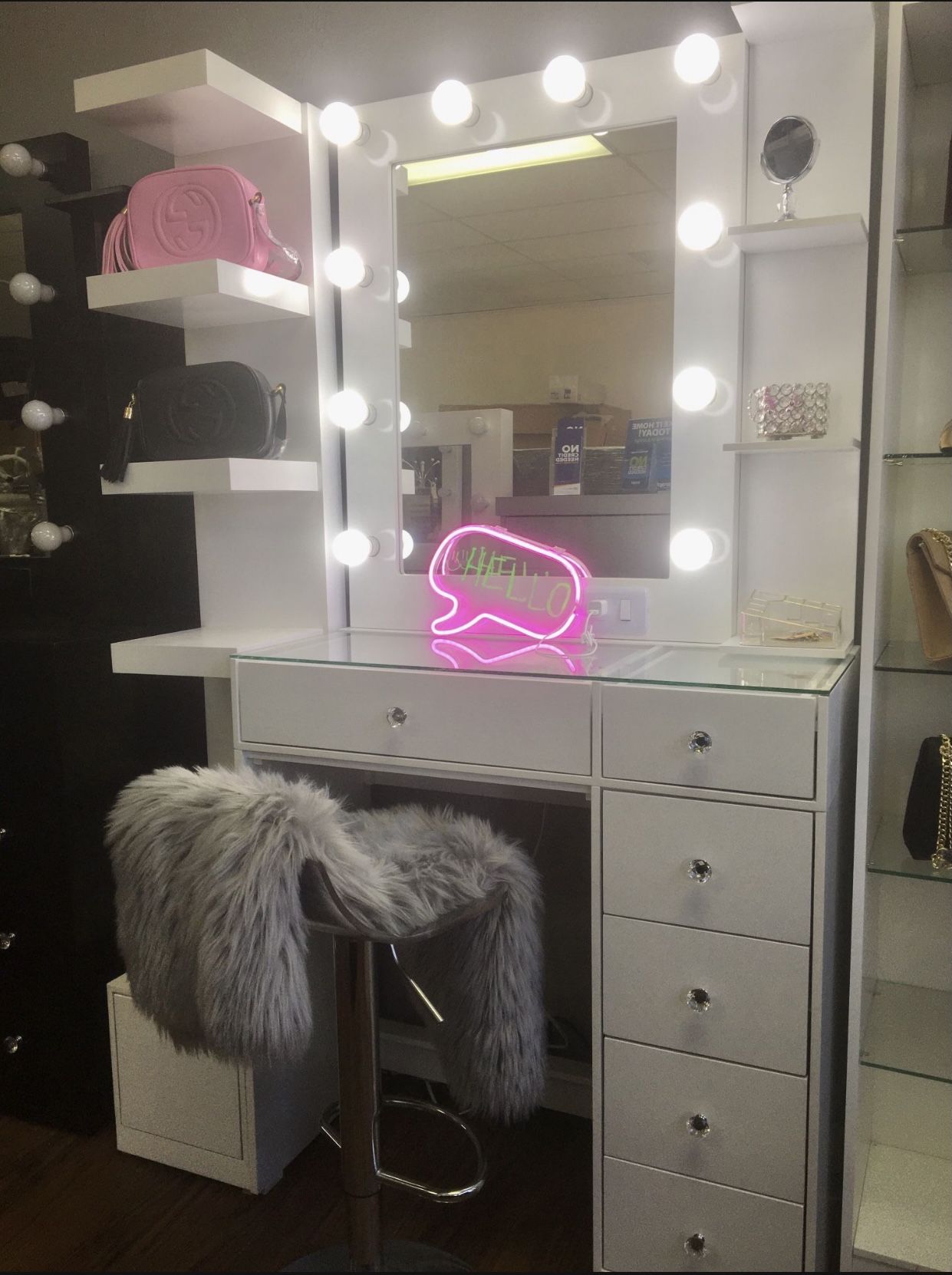 Includes vanity desk station with 6 drawers, crystal knobs, glass top and mirror. Financing available 3 months no interest👍 Delivery and assembly available. Hablo español 😊
