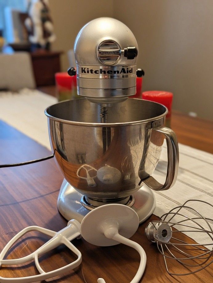 KitchenAid Artisan 5 qt Tilt Head Stand Mixer with a 5 quart stainless steel bowl, and brand new attachments: dough hook, whisk, and a flat beater. Works great, you can test it.
