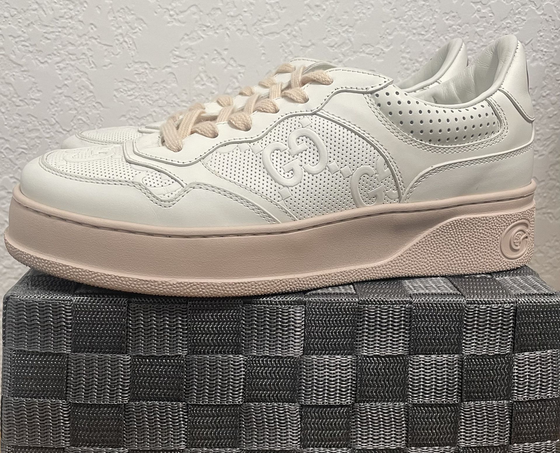 👟 Pre-owned |Gucci Women’s Sneakers |White | Jumbo GG Embossed | Leather Low Top | Size 8 1/2 Give your outfit a chic update with this pair of designer authentic Gucci GG embossed sneakers. 👟Highlights: o Size: 8 1/2 o Gender: Women o Series: GG sneaker o Condition: Pre-owned (worn 1x). Excellent condition. o Occasion: Lifestyle o Colorway: White/Beige o Exterior Material: Leather o Lining Material: Leather o Insole Material: Leather o Origin: Italy o Closure Type: Lace Up o Upper Style: Low Top o Outsole Width: 10.5 cm o Model: 684911-1XL10-9014 Shipping available within the U.S.