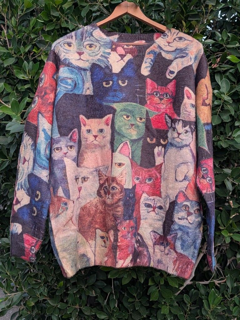 The Ultimate "Purr-sonality" Statement: Yesno Oversized Cat Collage Sweater Looking for the ultimate statement piece? This YESNO oversized cat sweater features a stunning, colorful feline collage graphic that is perfect for cat lovers and fans of maximalist fashion. Whether you’re going for a dark academia vibe, a grandmacore aesthetic, or just want a funky graphic knit, this sweater delivers. Crafted from a high-quality cotton-wool blend. It is super soft, fuzzy, and non-itchy, making it ideal for sensitive skin. Labeled as a Women's Oversized Large, but the generous cut makes it a perfect Unisex piece (fits like a Men's Medium/Large or Women's XL). Chunky warm knit with a classic crewneck and tunic length, perfect for pairing with leggings or vintage denim. Vibrant tapestry-style knit featuring various cat expressions in shades of blue, orange, and emerald green. Measurements (Approximate - Lying Flat): Pit to Pit: 25.5” Waist: 21.5” Shoulder to Hem (Front & Back): 27.5” This sweater is in excellent condition and ready to become the most talked-about item in your wardrobe. Perfect for cozy coffee dates, creative office spaces, or just lounging with your own feline friends! #CatSweater #OversizedKnit #Yesno #GraphicSweater #UnisexStyle #GrandmaCore #Maximalist #AnimalPrint #CozyVibes #TunicSweater #Knitwear #Streetwear