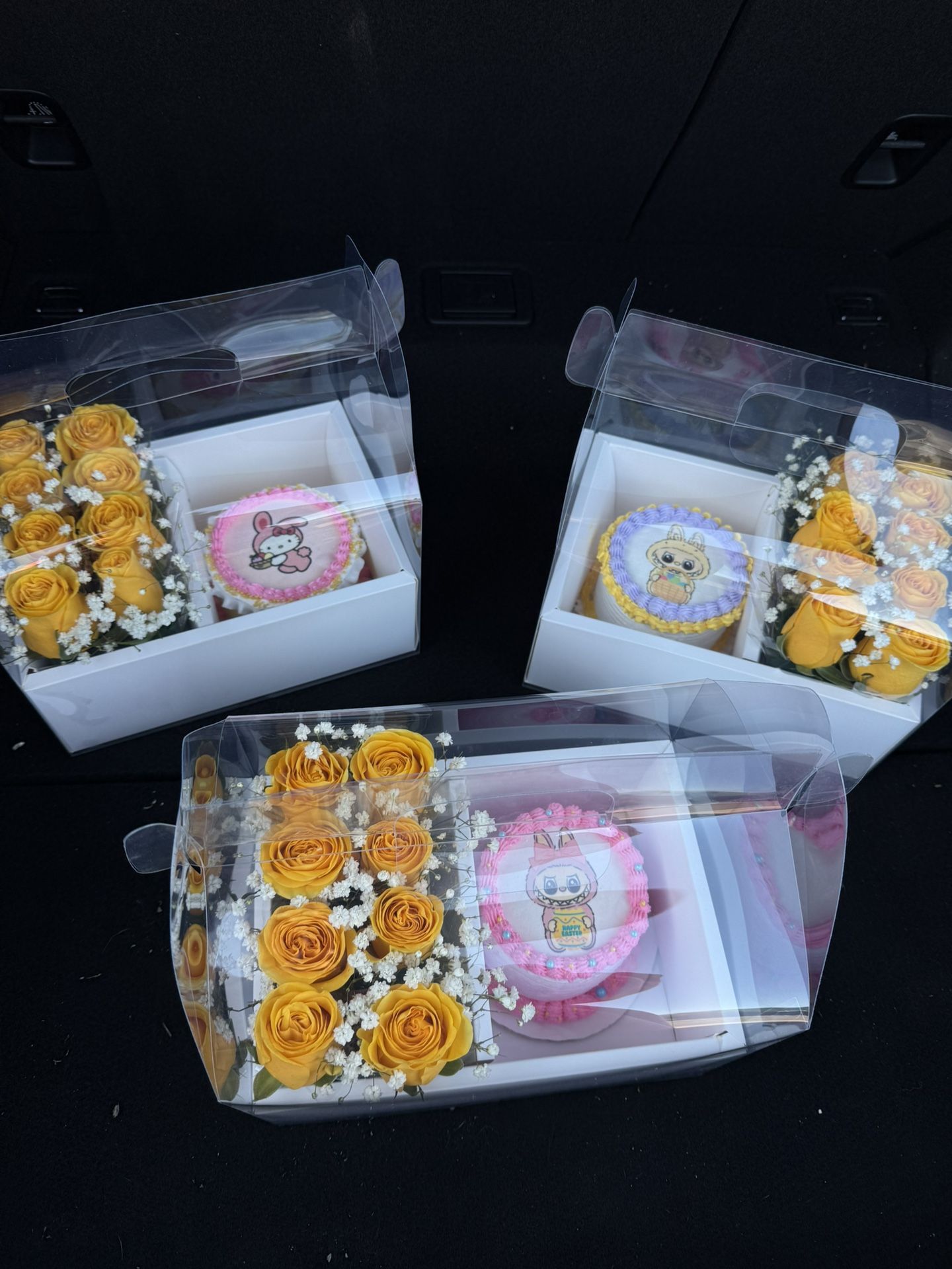 Sets of 8 roses baby’s breath & bento cakes $ 65 Individual bouquet or basket $30 Individual bento cakes $22 Make a set with your choice of basket or bouquet + 1 bento cake for $50 Dm for flavors and more