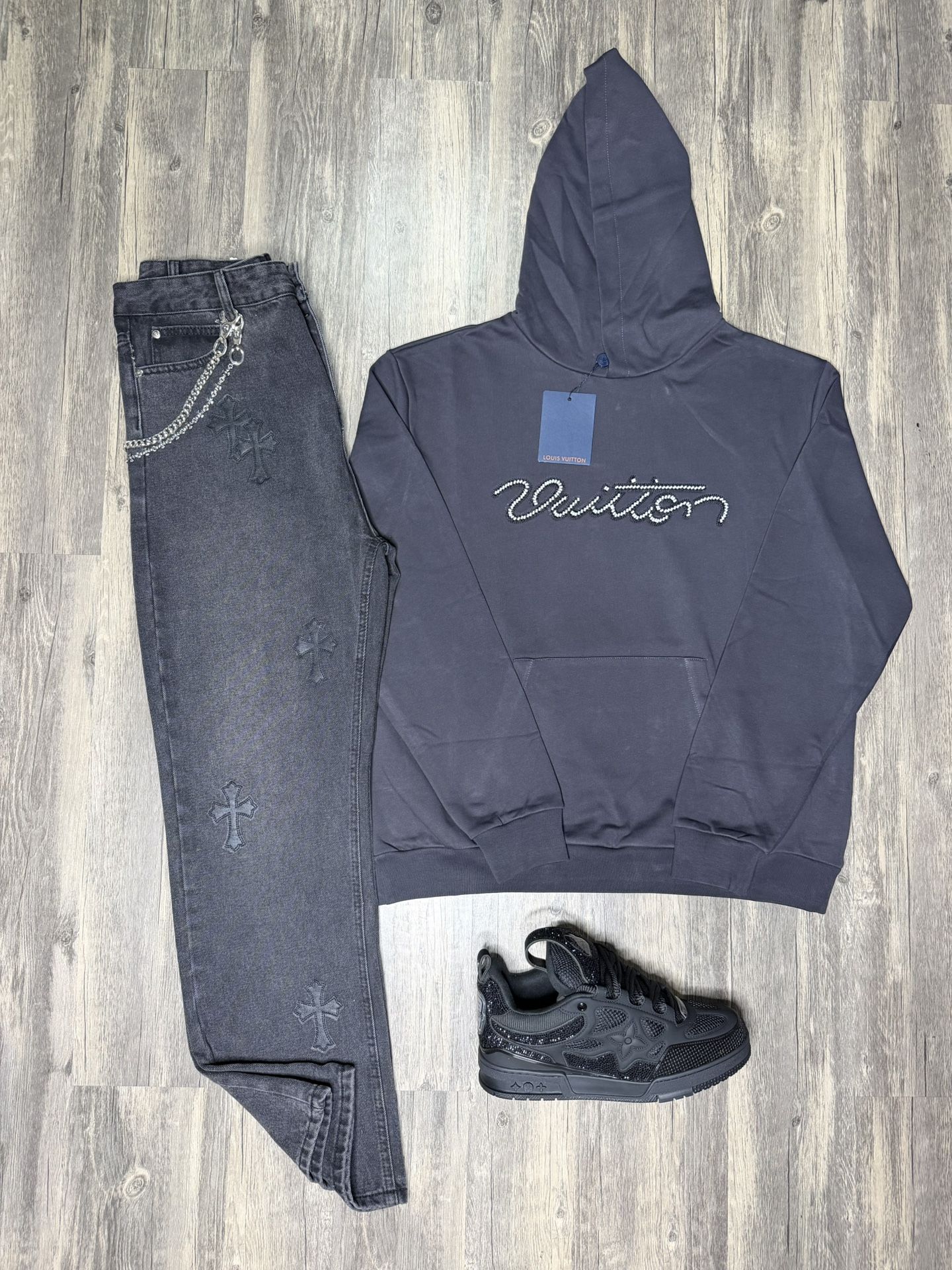 Louis Vuitton Hoodie, Chrome Heart Jeans, Lv Wallet Chain Brand New With Box And Dust Cover Hoodie size small, medium, large, xl, and 2xl available Jeans size 34 and 36 available Lv chain comes with box Lv shoe sold out currently